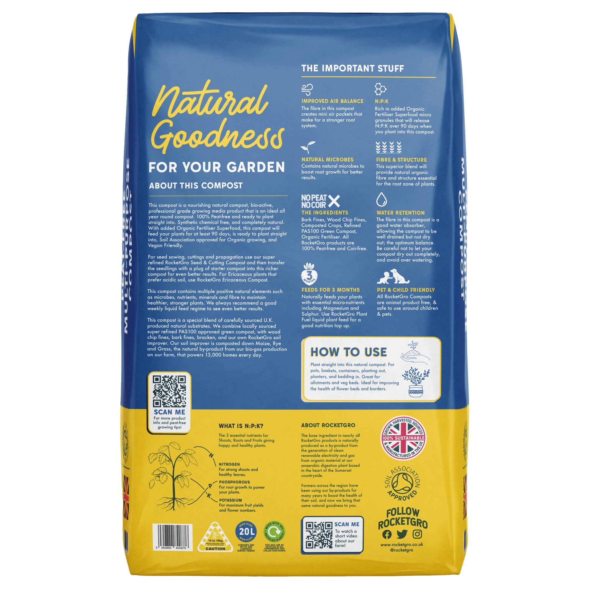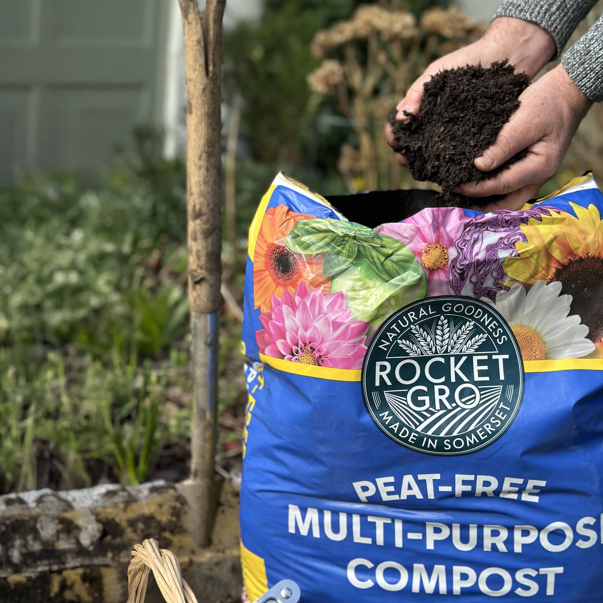 Ingredients include digestate fibre (composted down maize, rye, and grass), line bark fines, wood chip fines, and super refined PAS 100 green compost. RocketGro’s Organic Fertiliser Superfood is then added right before the compost is bagged up, ensuring it remains fresh and ready to enhance your plants.