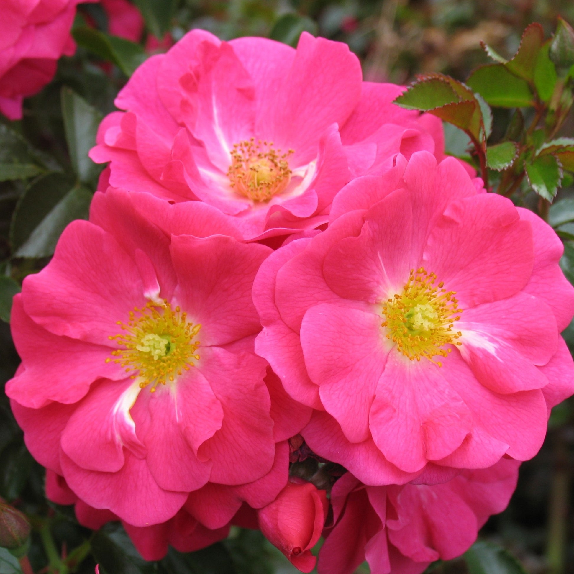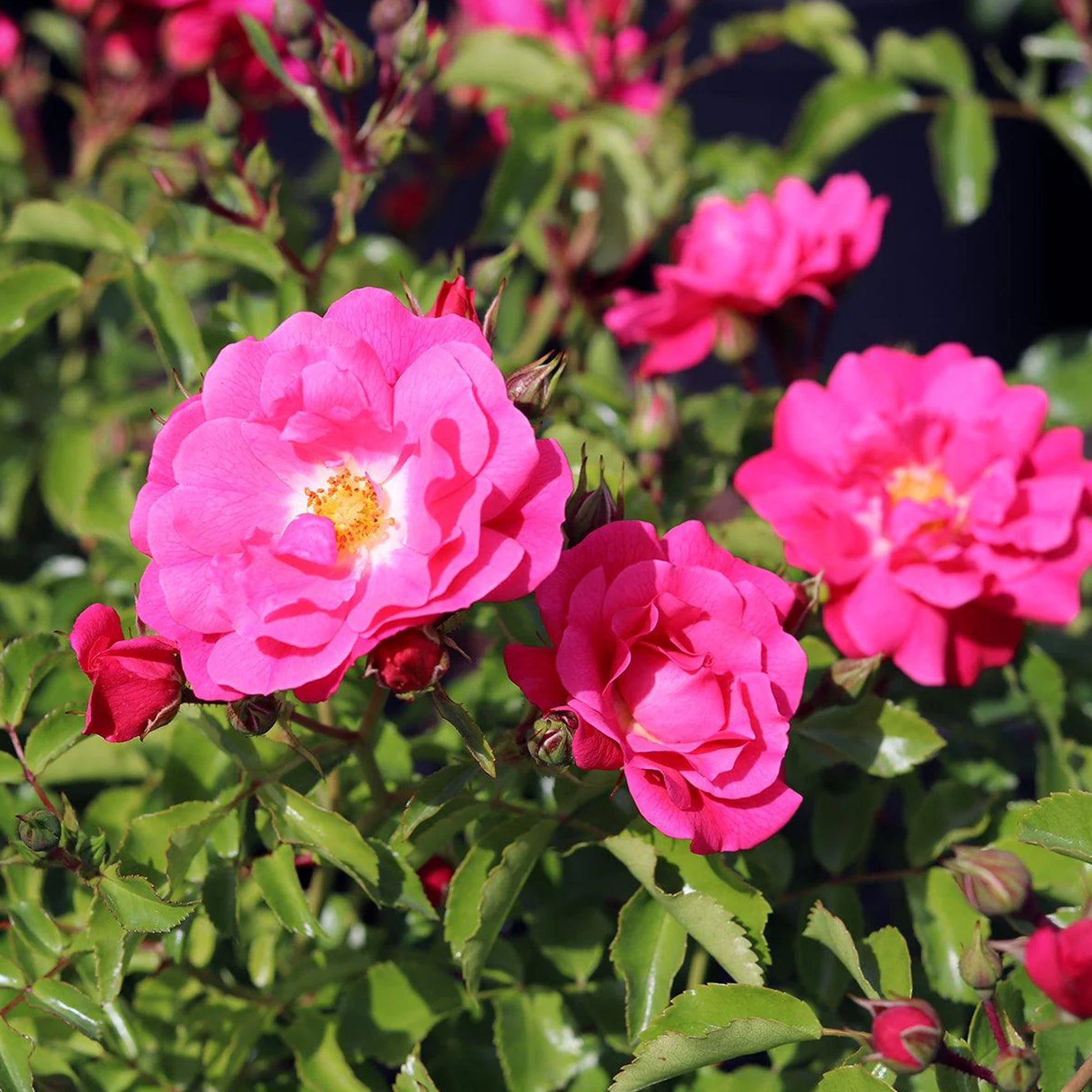 Glossy dark-green leaves emerge in spring, providing the perfect backdrop for the clusters of small semi-double roses that bloom in summer. Appearing as early as June and repeat-flowering until the first frosts, the eye-catching bright pink roses are lightly scented and will be the envy of your neighbours all season long.