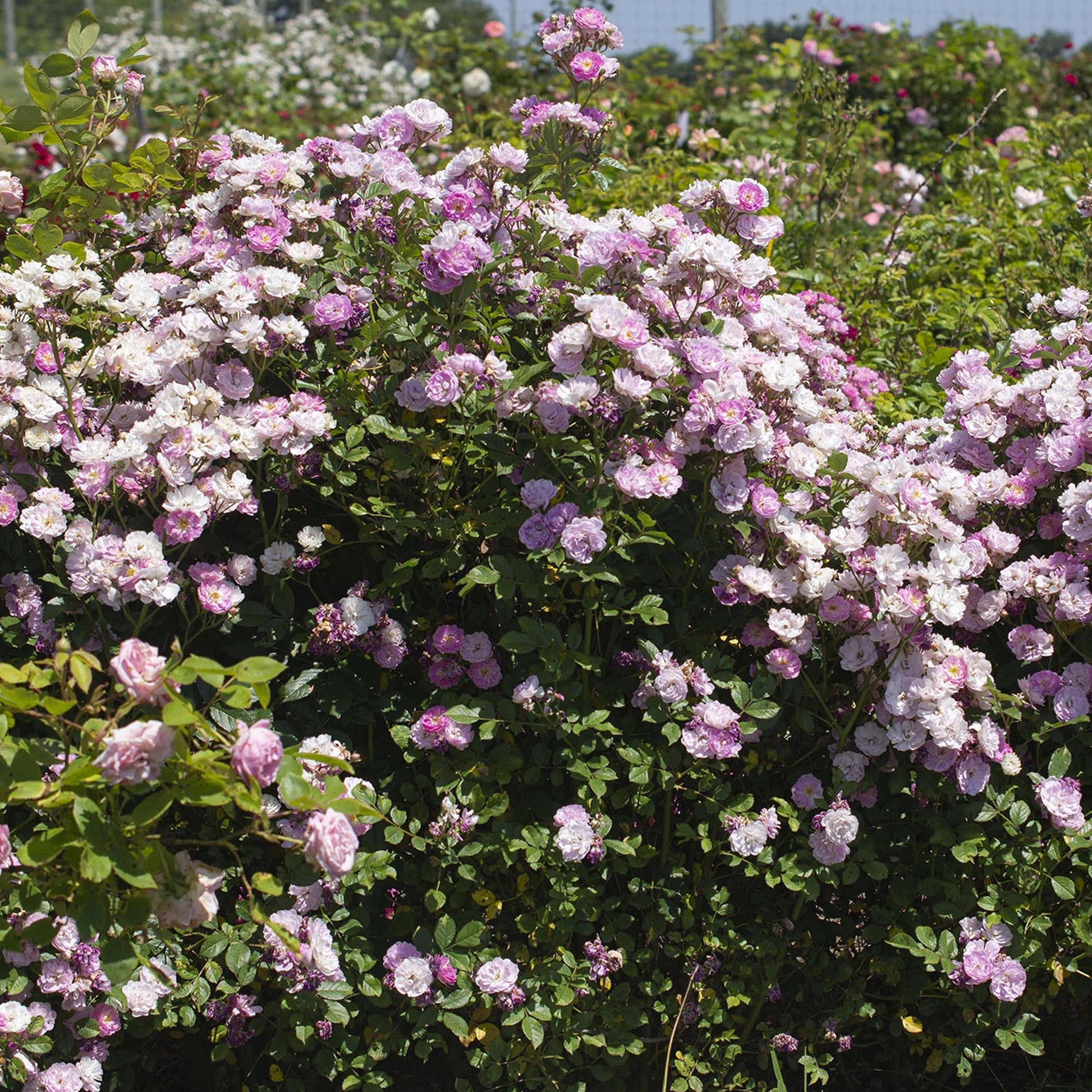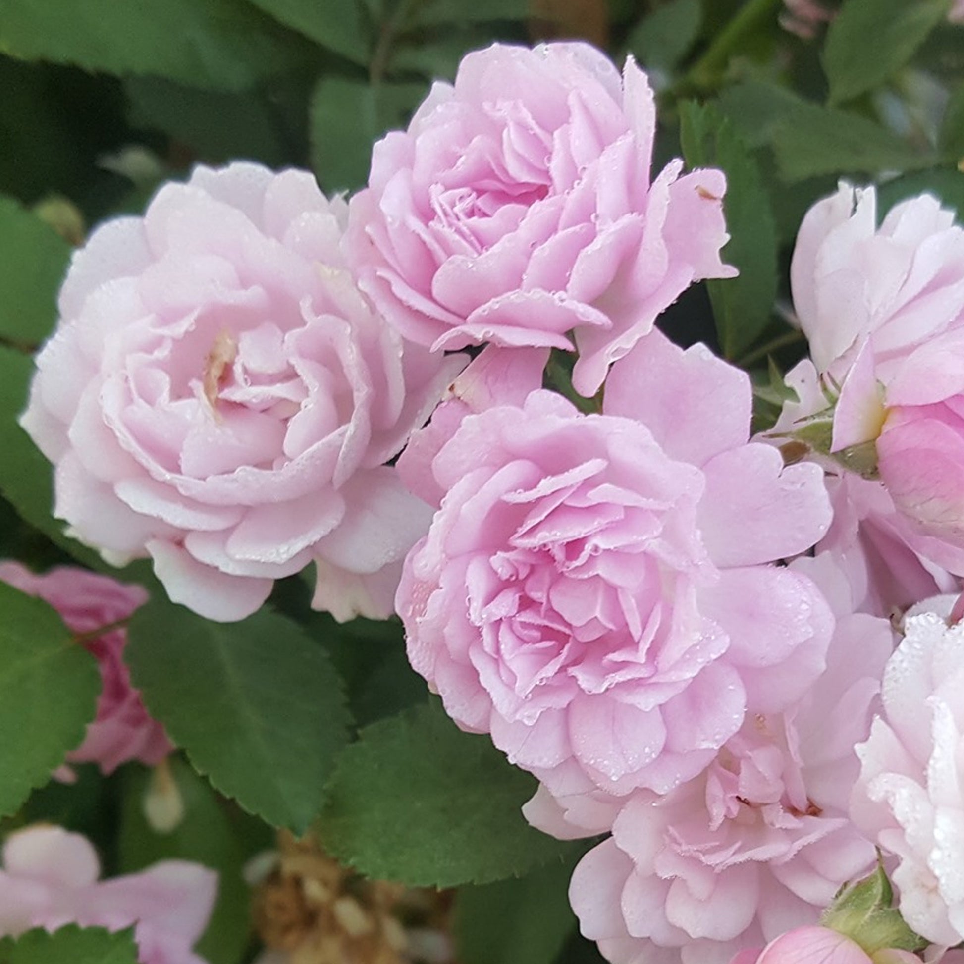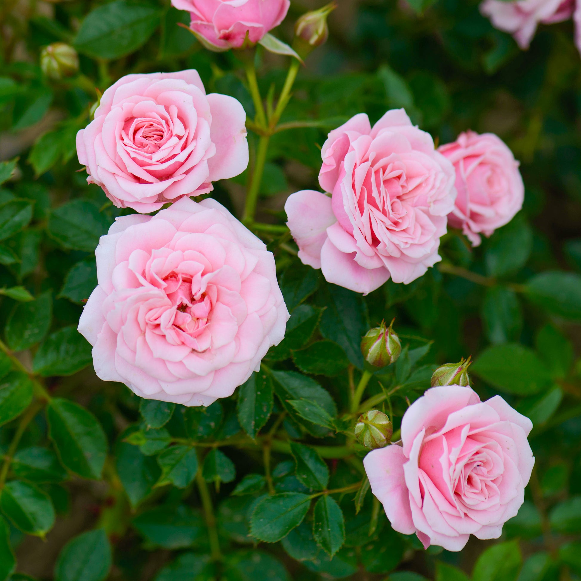 Glossy mid-green leaves emerge in spring, providing the perfect backdrop for the clusters of small double roses that bloom in summer. Appearing as early as June and repeat-flowering into September, the eye-catching pale pink roses are lightly scented and will be the envy of your neighbours all summer long.