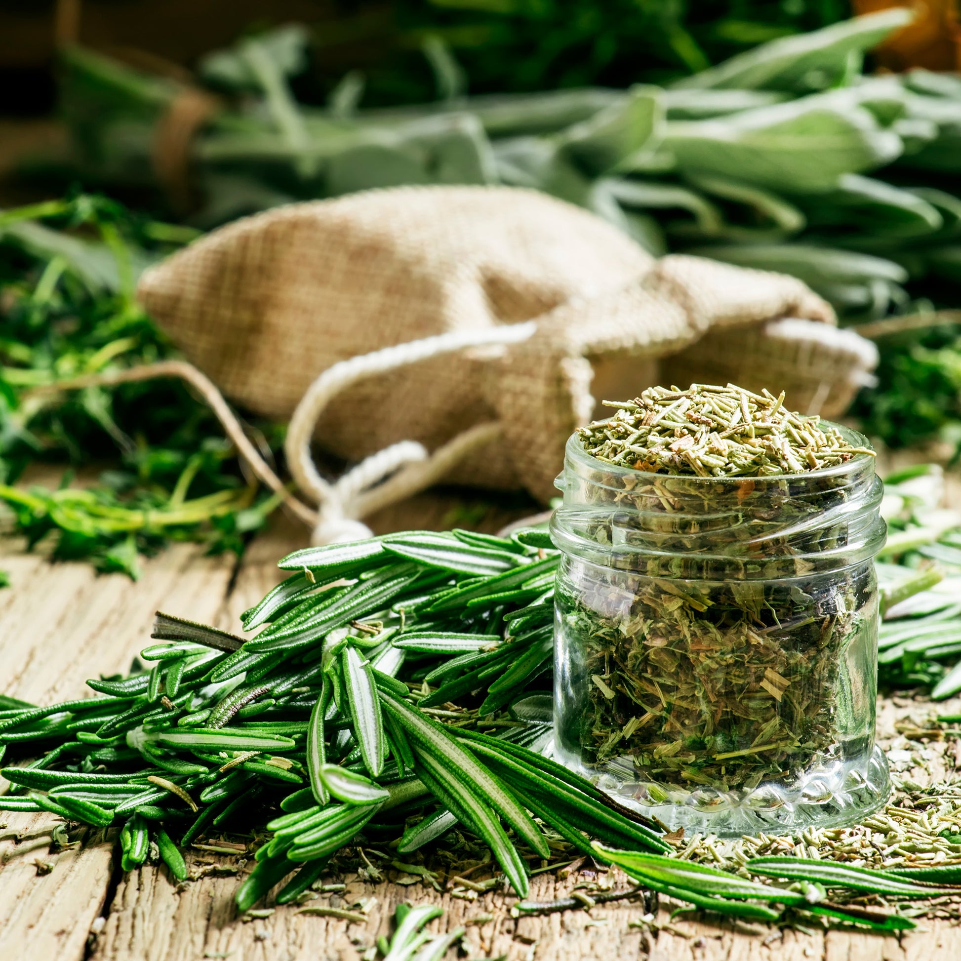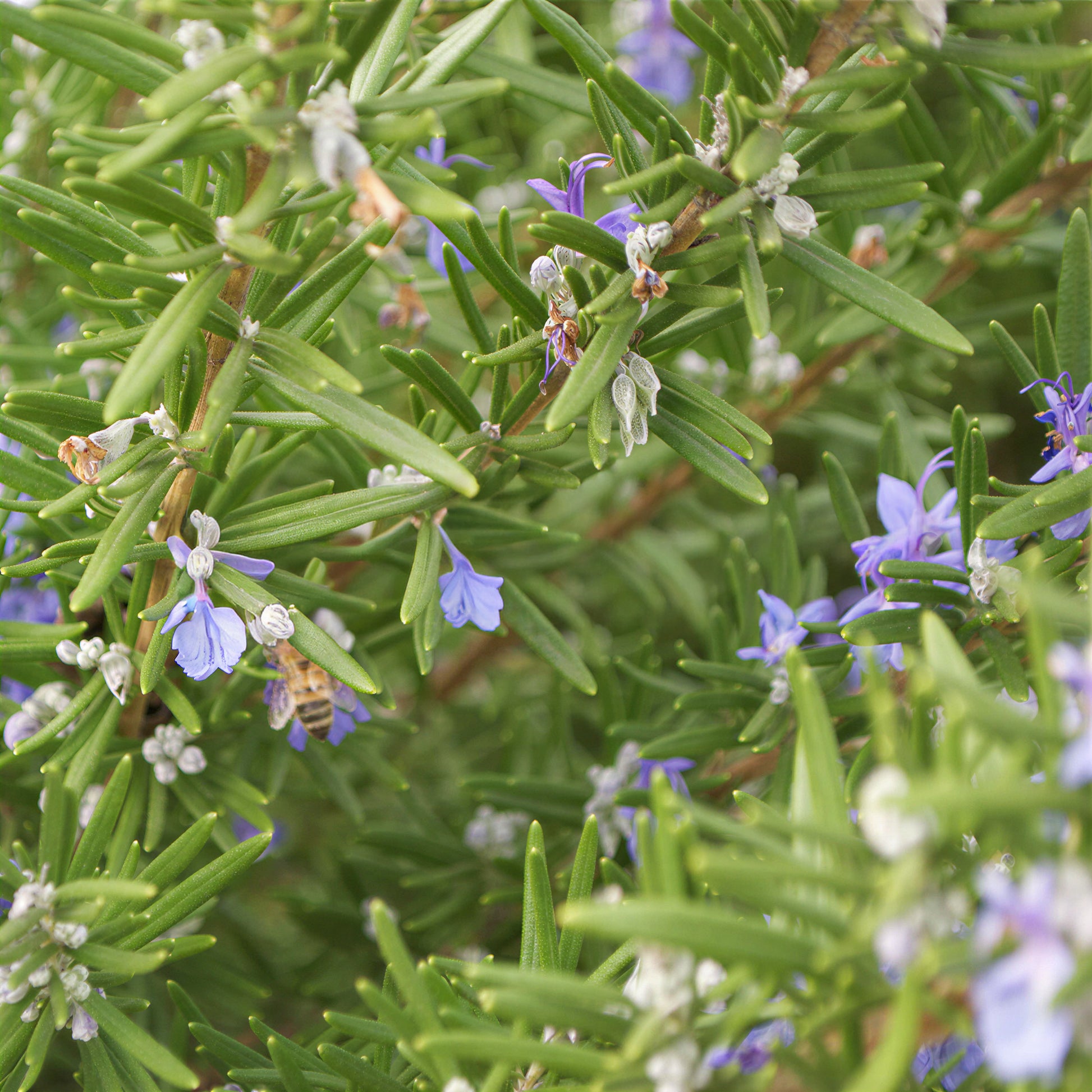 A sun-loving perennial whose scent evokes the Mediterranean, rosemary has needle-like leaves that can be picked all year round. Fresh or dried leaves can be used to flavour meat, soups and many other dishes, while sprigs steeped in olive oil give it a distinctive flavour. Tea made by infusing chopped leaves in boiling water helps digestion.