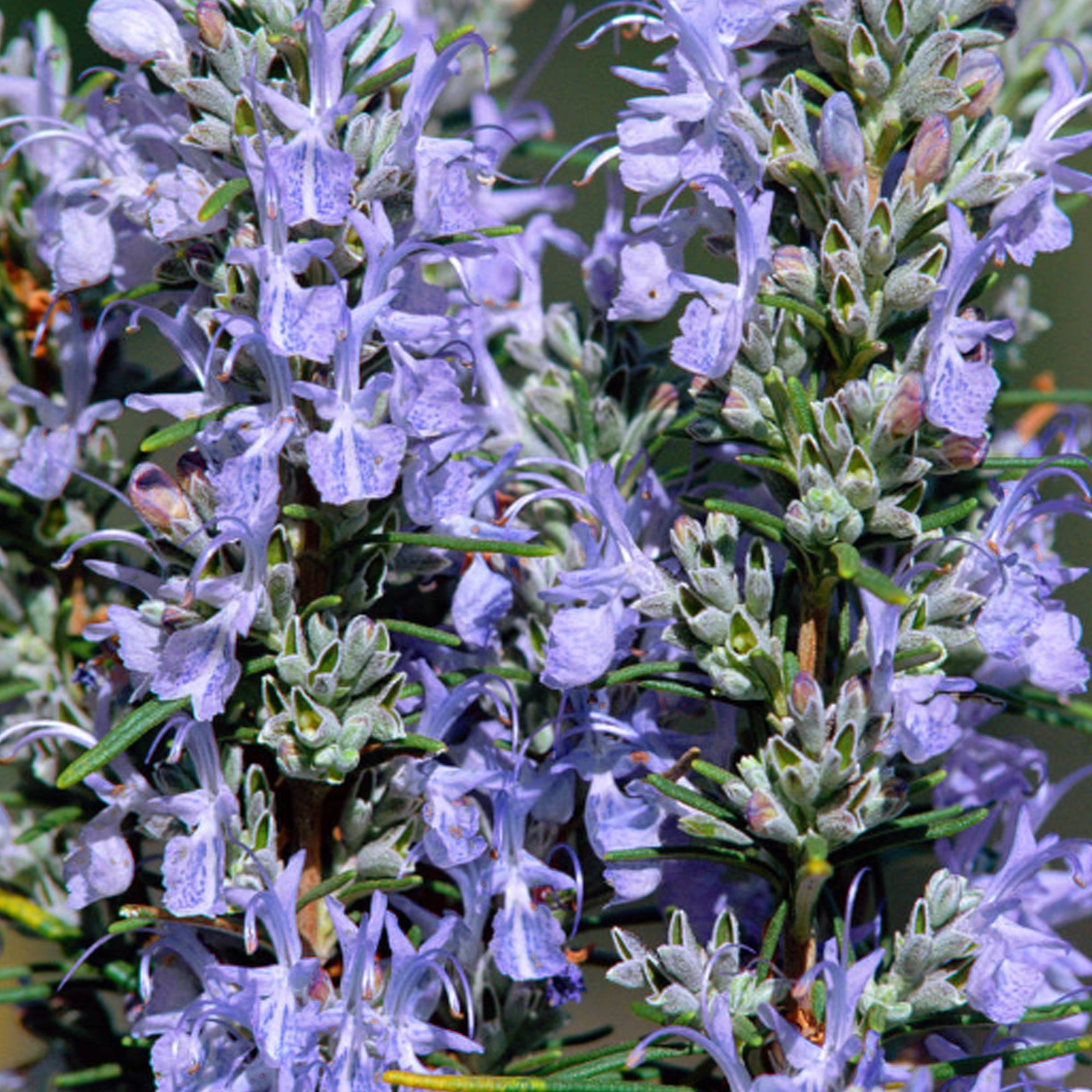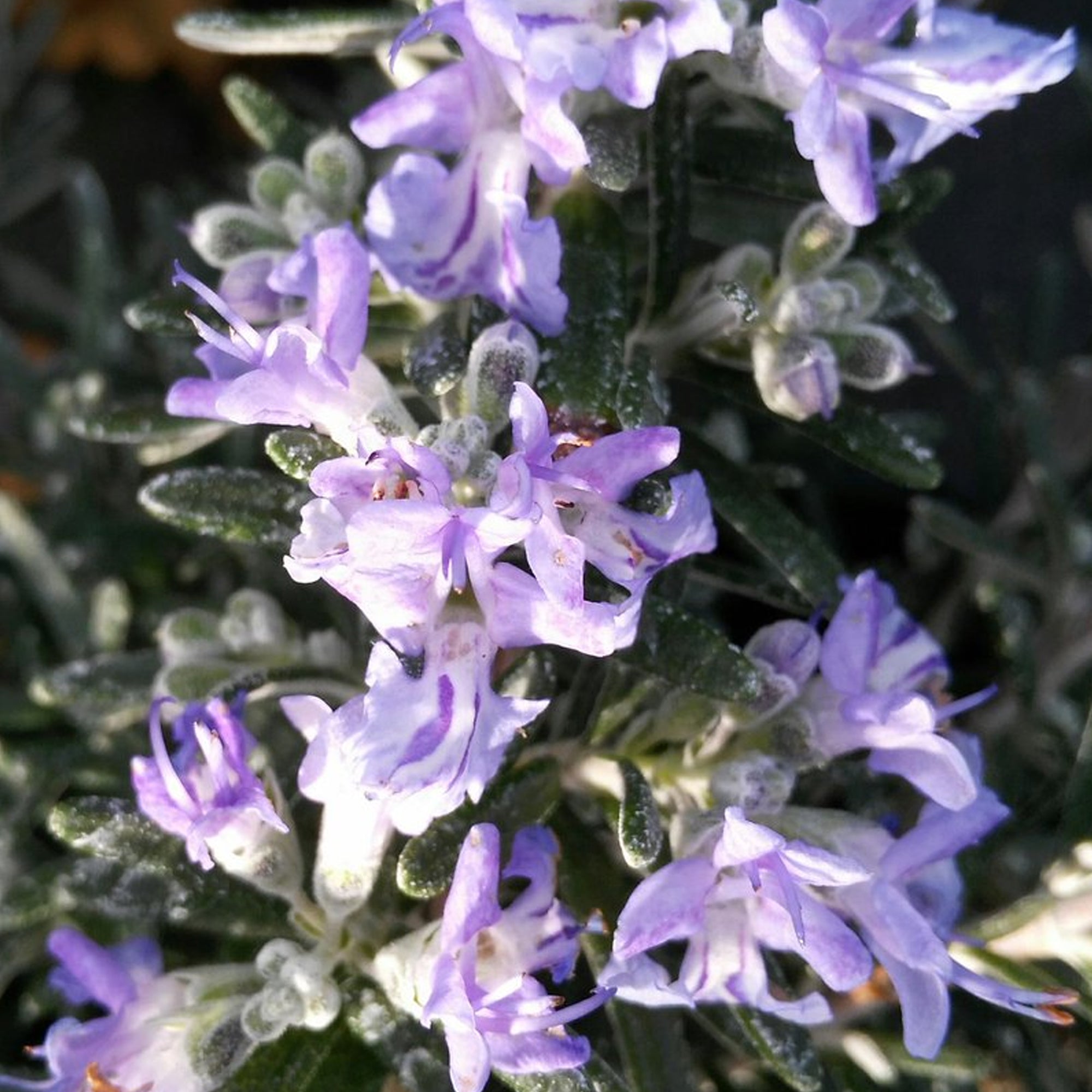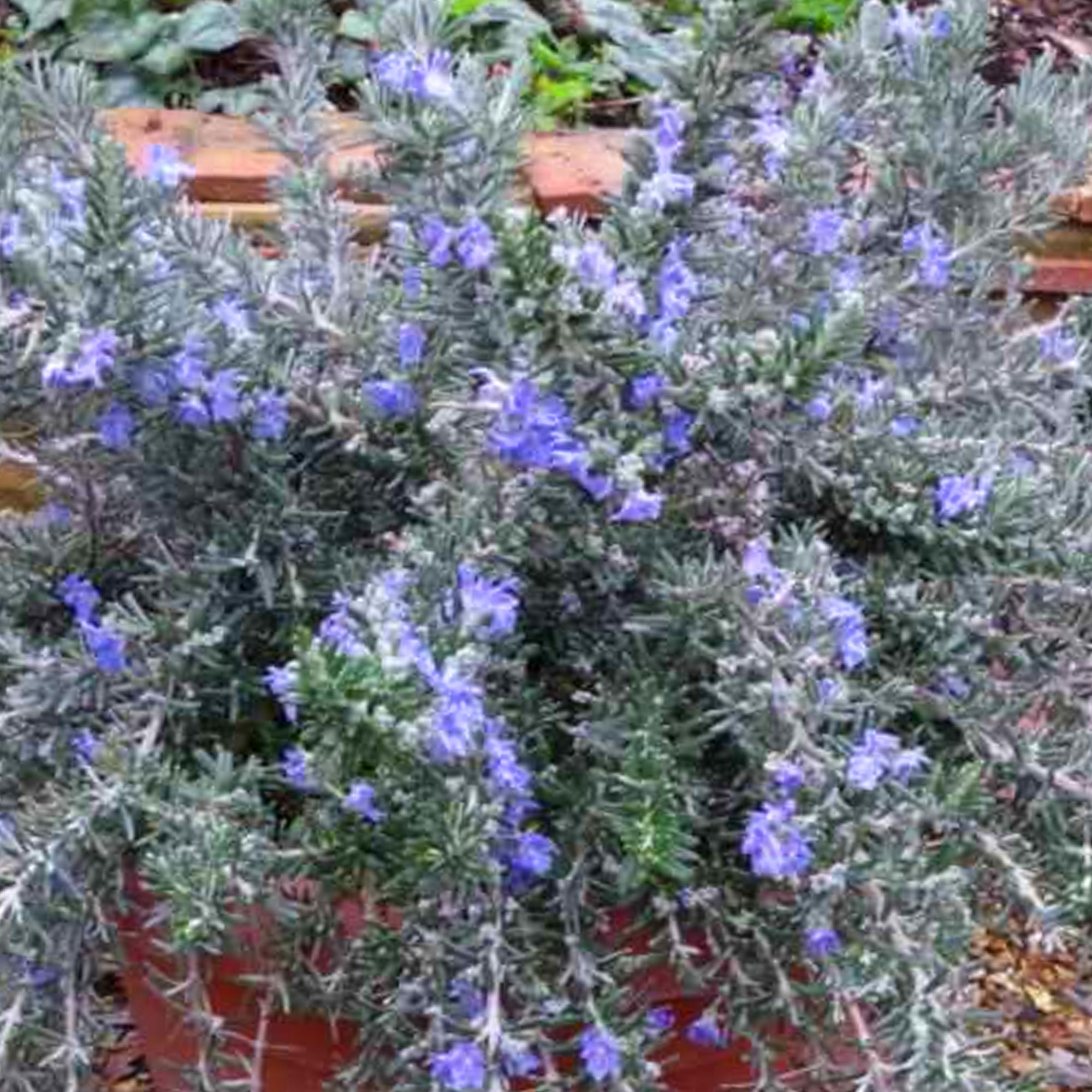 Rosemary 'Whitewater Silver' is a striking evergreen variety cultivated primarily for its distinctive, arching stems and foliage that flashes with bright silver undersides, resembling the spray of rushing water. While it possesses the classic, resinous pine scent and flavour of traditional rosemary, making it perfectly edible for roasting meats and potatoes, it is most often prized for its ornamental value. In spring, it produces masses of pale blue to white flowers that are highly attractive to bees, adding vibrant life to rockeries and walls.