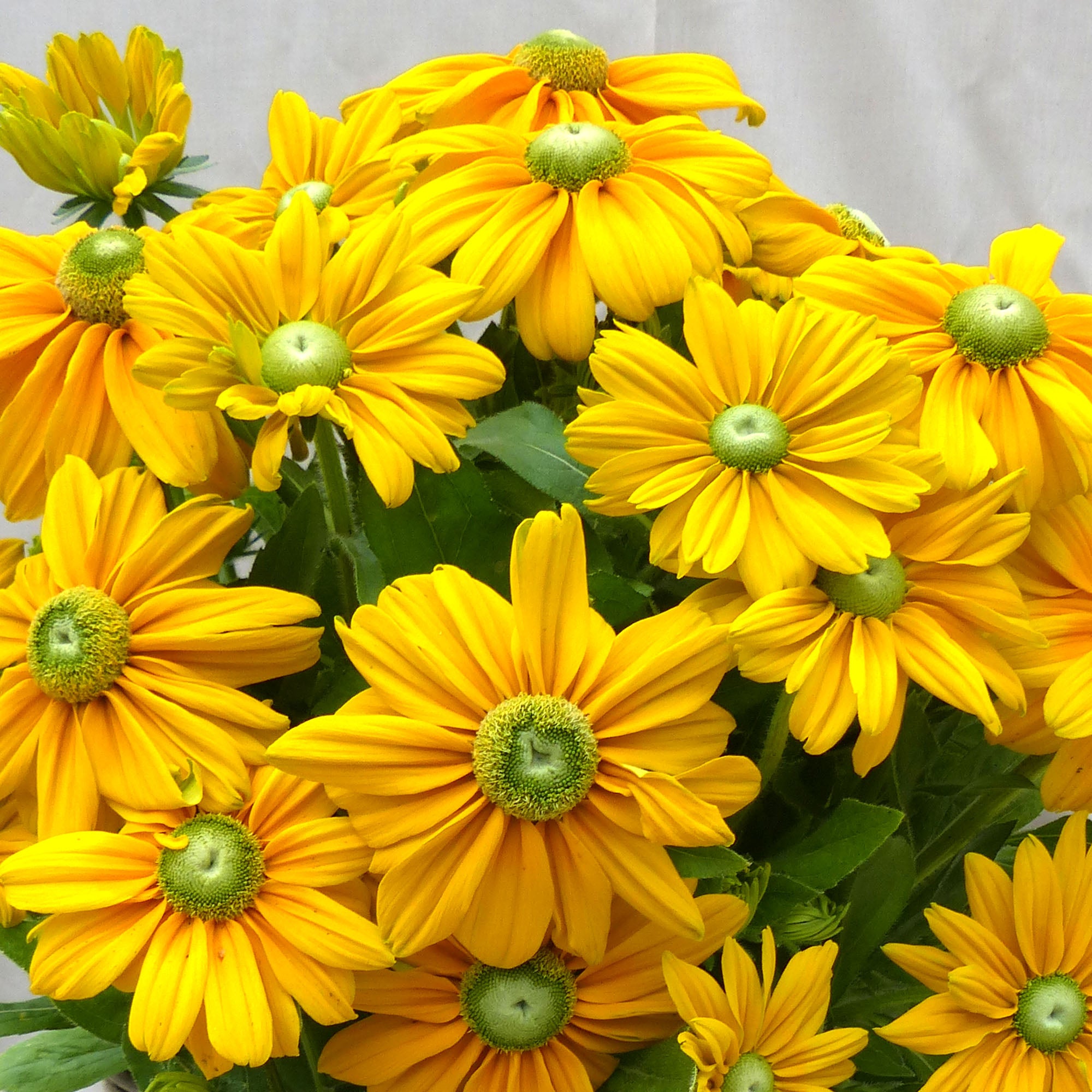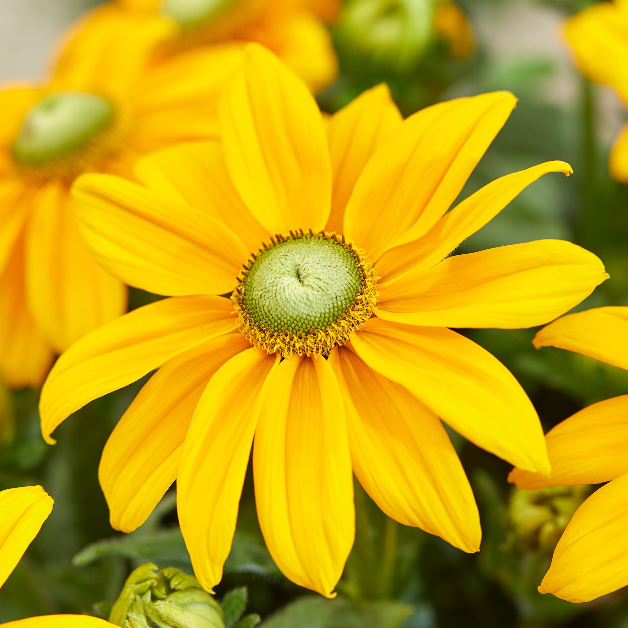 Rudbeckia Sunbeckia Ophelia is a radiant perennial that lights up gardens with its large golden-yellow blooms and gentle green centres. Its compact, upright habit makes it perfect for injecting colour into beds, borders, or patio containers. The daisy-like flowers sit proudly above lush green foliage, offering classic cottage garden charm with a contemporary twist.