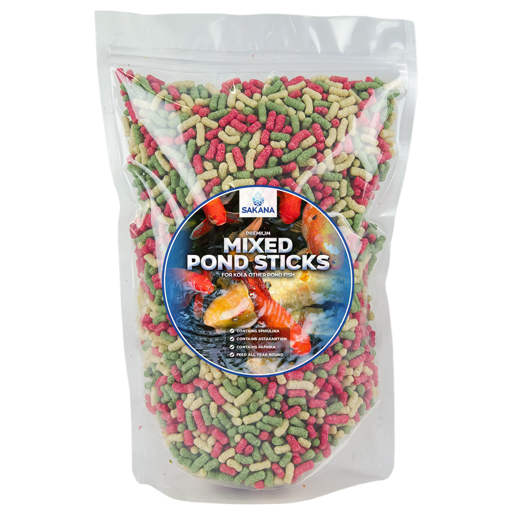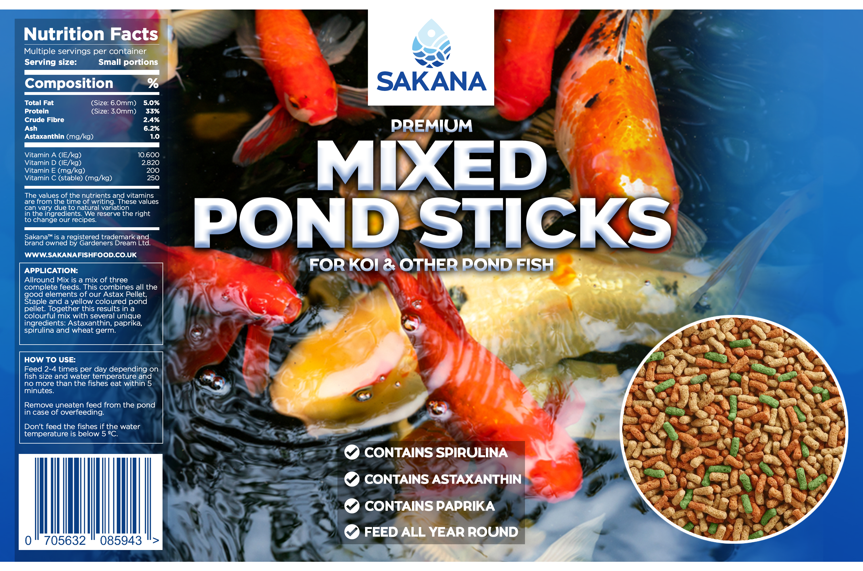 Sakana Premium Sticks Mix are a multicoloured feeding solution all cold water pond dwelling fish. This mix contains spirulina and paprika to ensure your fish has a consistently vibrant colour, and is packed with vitamins and nutrients such as wheatgerm and Vitamin C that promote good health and a strong immune system to fight disease. This balanced feed can be used 2-4 times per day, depending on the size of the fish and the temperature of the water, so please gauge the amount of neccesary food accordingly. This feed is comprised of all natural and responsibly sourced ingredients, they are easy to digest, produce far less waste and keep the water in your pond or tank clearer for longer.