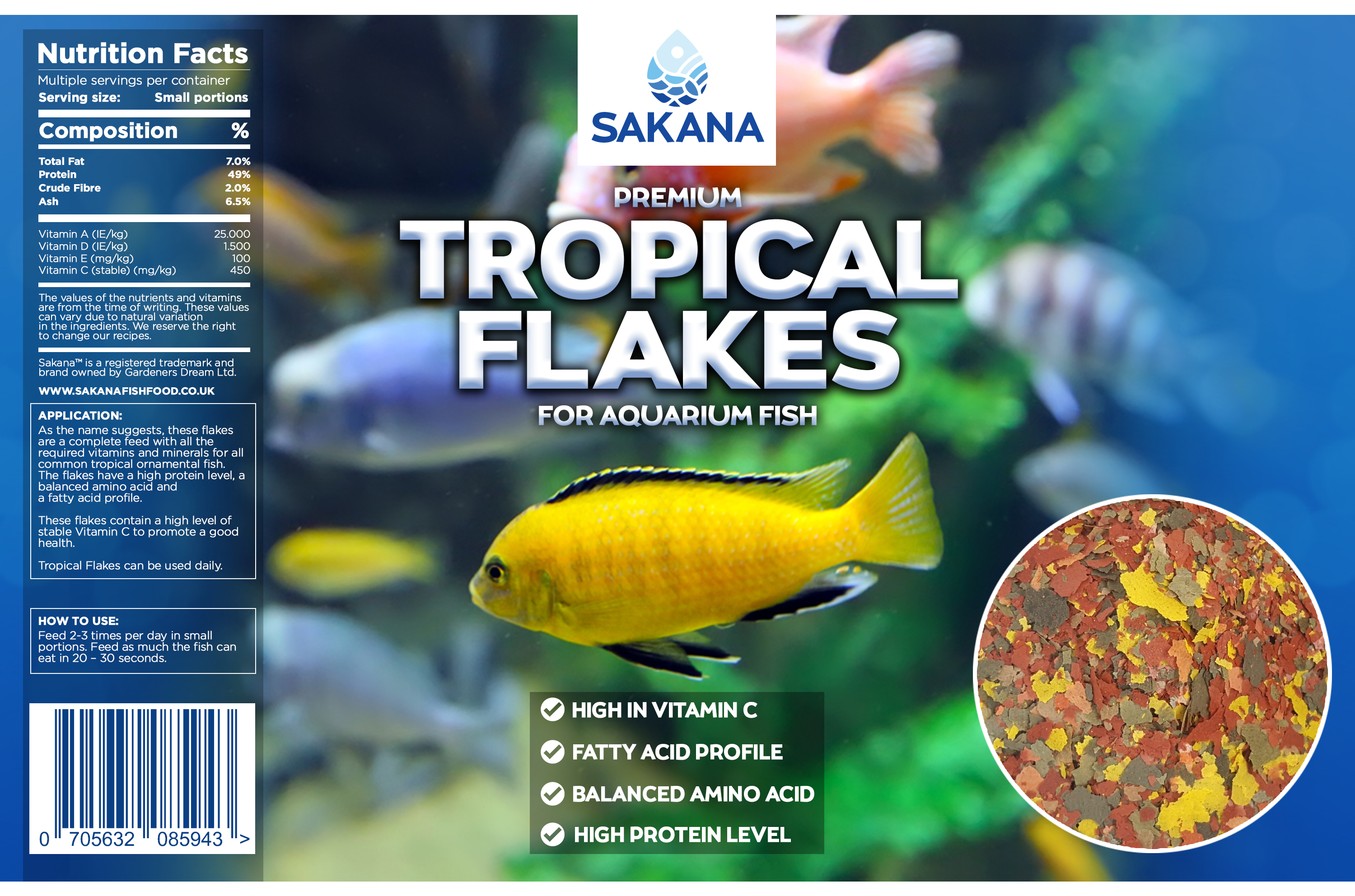 Sakana Tropical Fish Flakes are the perfect all-round feed for pond-dwelling fish such as Goldfish, Ide, Koi and Carp. These light flakes are packed with important nutrients and minerals like protein and Vitamin C, these help to promote good health and a strong immune system to resist disease. This balanced feed can be used 2-3 times per day, and it covers the whole surface so that your hungry fish can eat as much as they can handle in one go. This feed is comprised of all natural and responsibly sourced ingredients, they are easy to digest, produce far less waste and keep the water in your pond or tank clearer for longer.