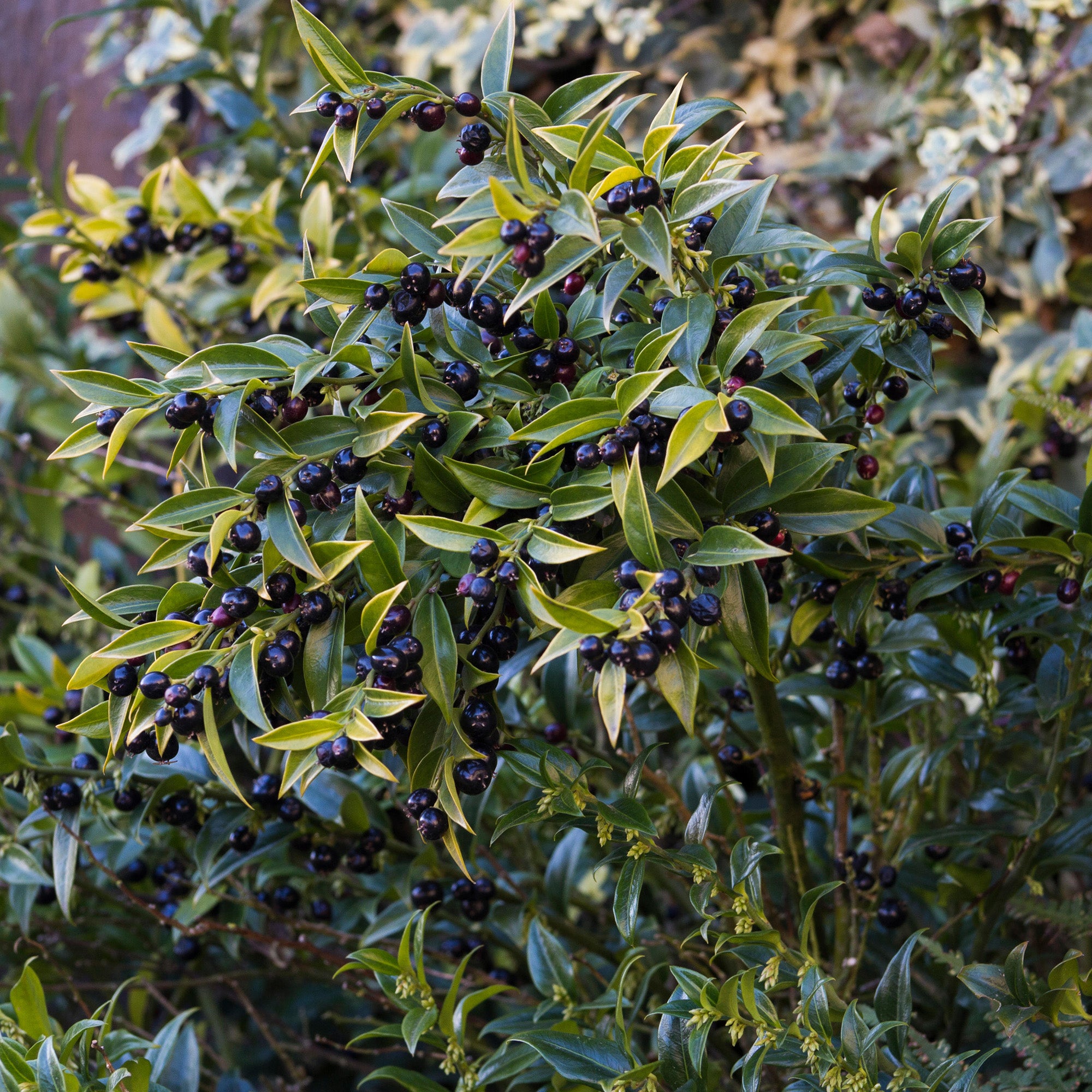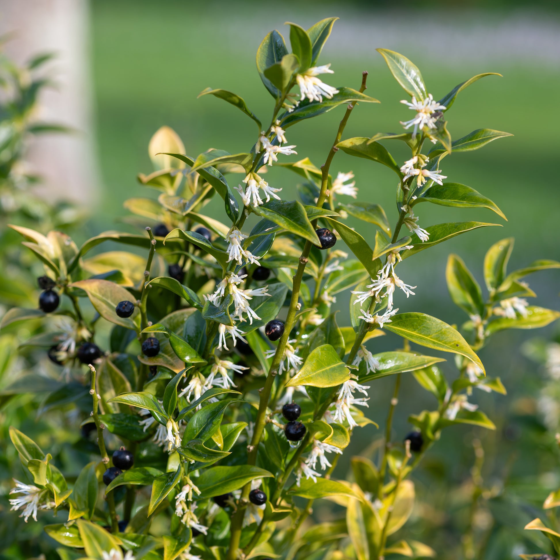“Christmas Box” is a wonderful upright and bushy evergreen shrub which blooms during the winter. These highly fragrant white flowers will perfume the air. The flowers are followed by glossy, deep red to black coloured fruits. The flowers are interspersed throughout the plant on the underside of the stalks. Due these wonderful aromas, it is also known as the “Sweet Box” and attracts pollinators like bees and butterflies.