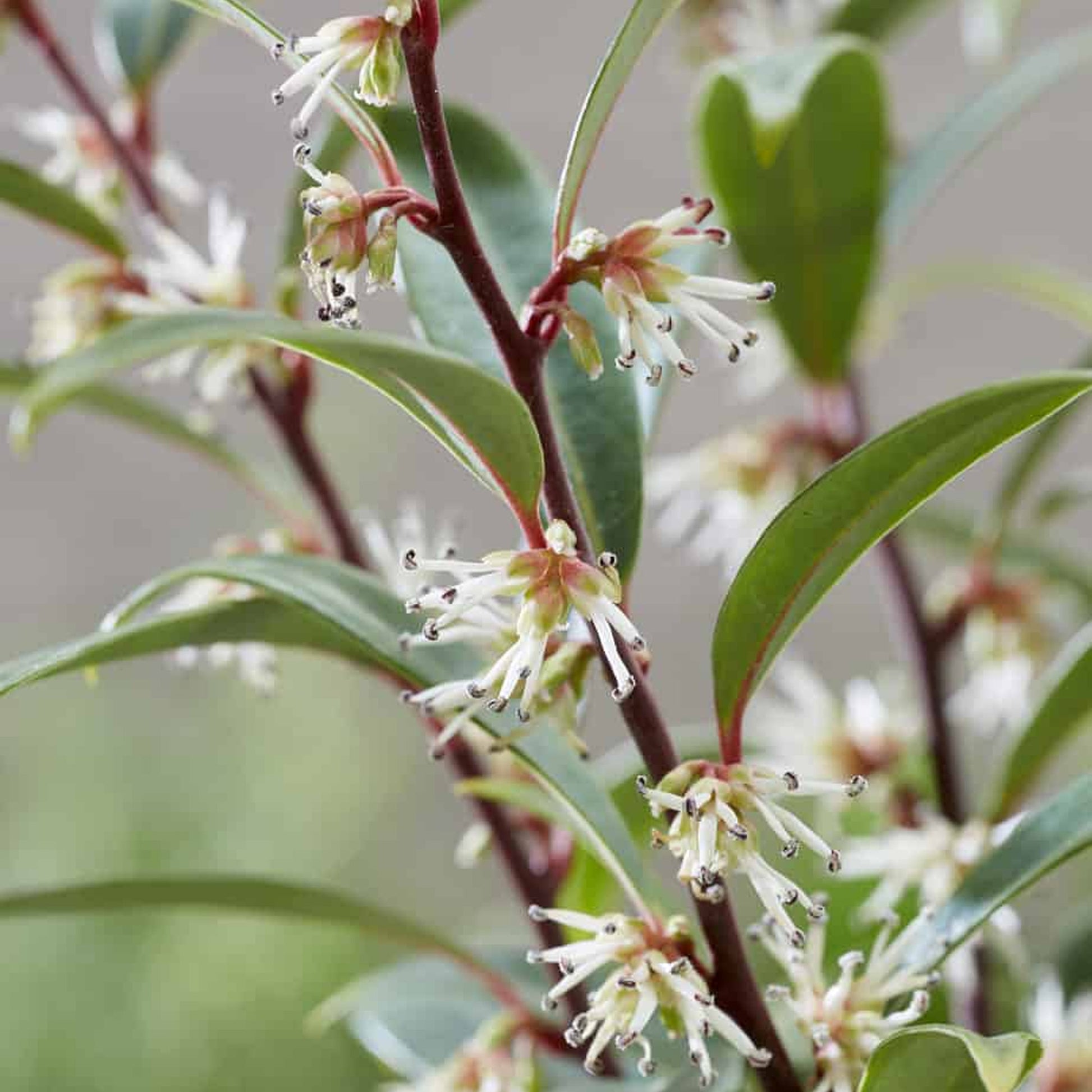 Also known as Sweet Box, Sarcococca is a hardy, low-maintenance garden shrub that is easy to grow. It prefers a sheltered spot in partial to full shade, however, it can tolerate full sun providing the soil is kept reliably and constantly moist. Sarcococca Purple Gem thrives in moderately fertile, well-draining soil and doesn’t require any regular pruning.
