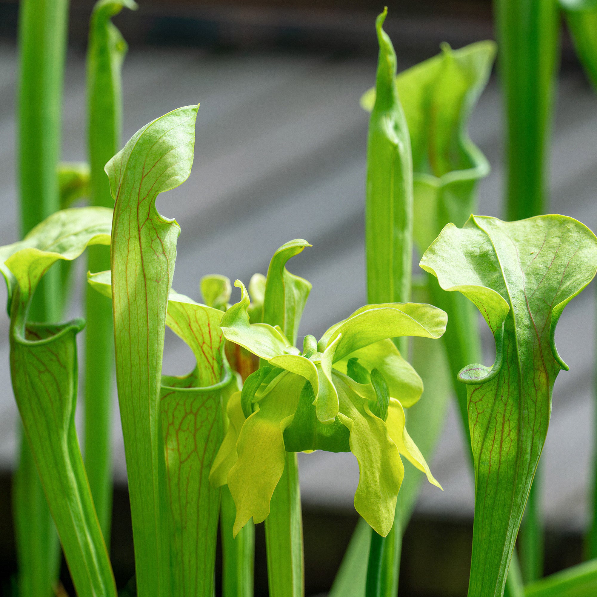 To plant Sarracenia plants, use a pot with good drainage filled with a soil mix of sphagnum moss and sand or perlite to mimic its natural boggy habitat. Avoid using fertilised or nutrient-rich soil, as these plants thrive in nutrient-poor environments. Place the pot in a sunny location, as they require at least 6 hours of direct sunlight daily to thrive. When planting, ensure the rhizome is just above the soil surface, and water thoroughly to settle the soil around the roots.