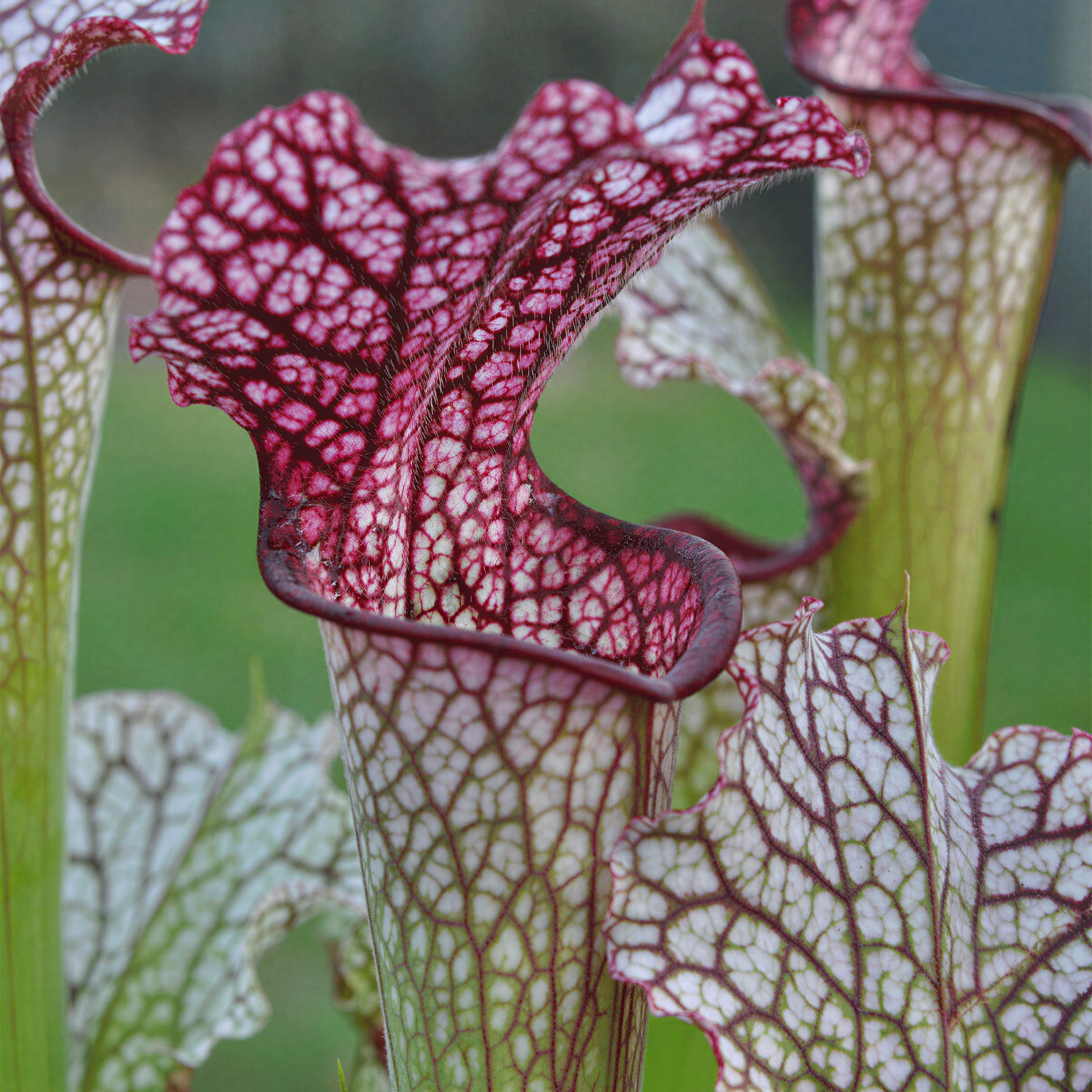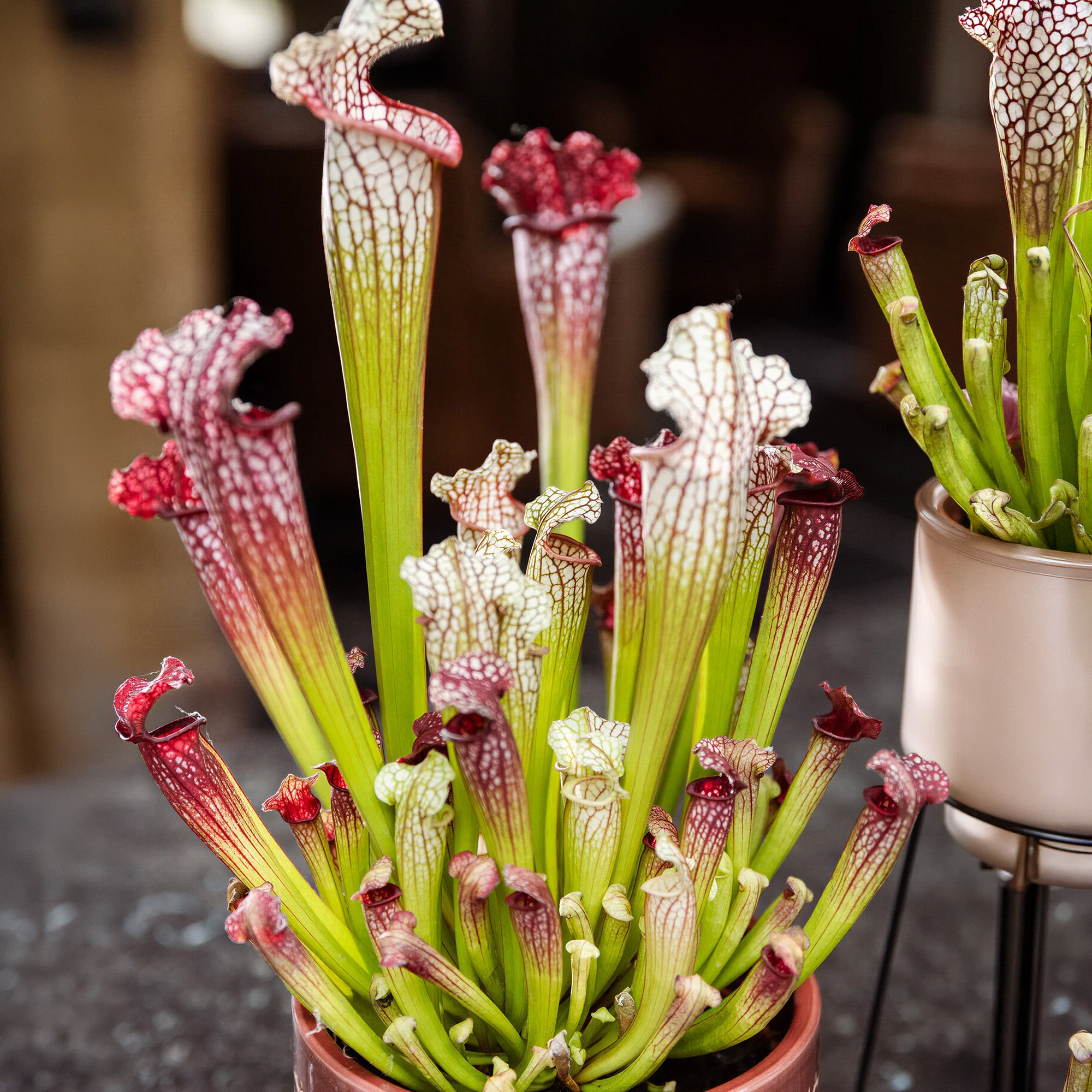 The White-Topped Pitcher Plant (Sarracenia leucophylla) is a striking addition to any indoor collection. Its tall, elegant pitchers are topped with delicate white hoods patterned in green and red, creating a dramatic display that is both unusual and eye catching. This plant is admired not only for its appearance but also for its fascinating way of catching insects, making it a conversation piece as well as a decorative houseplant.