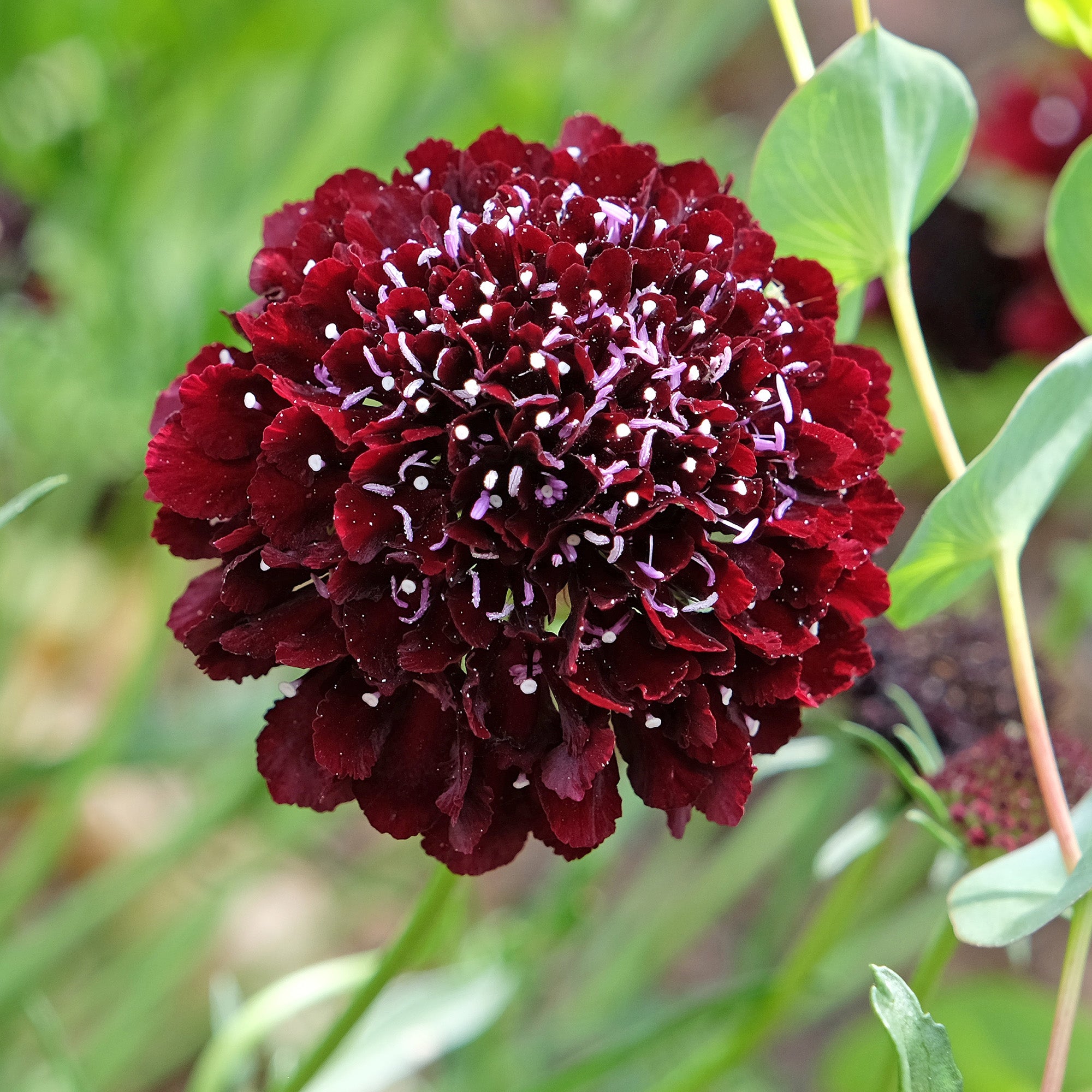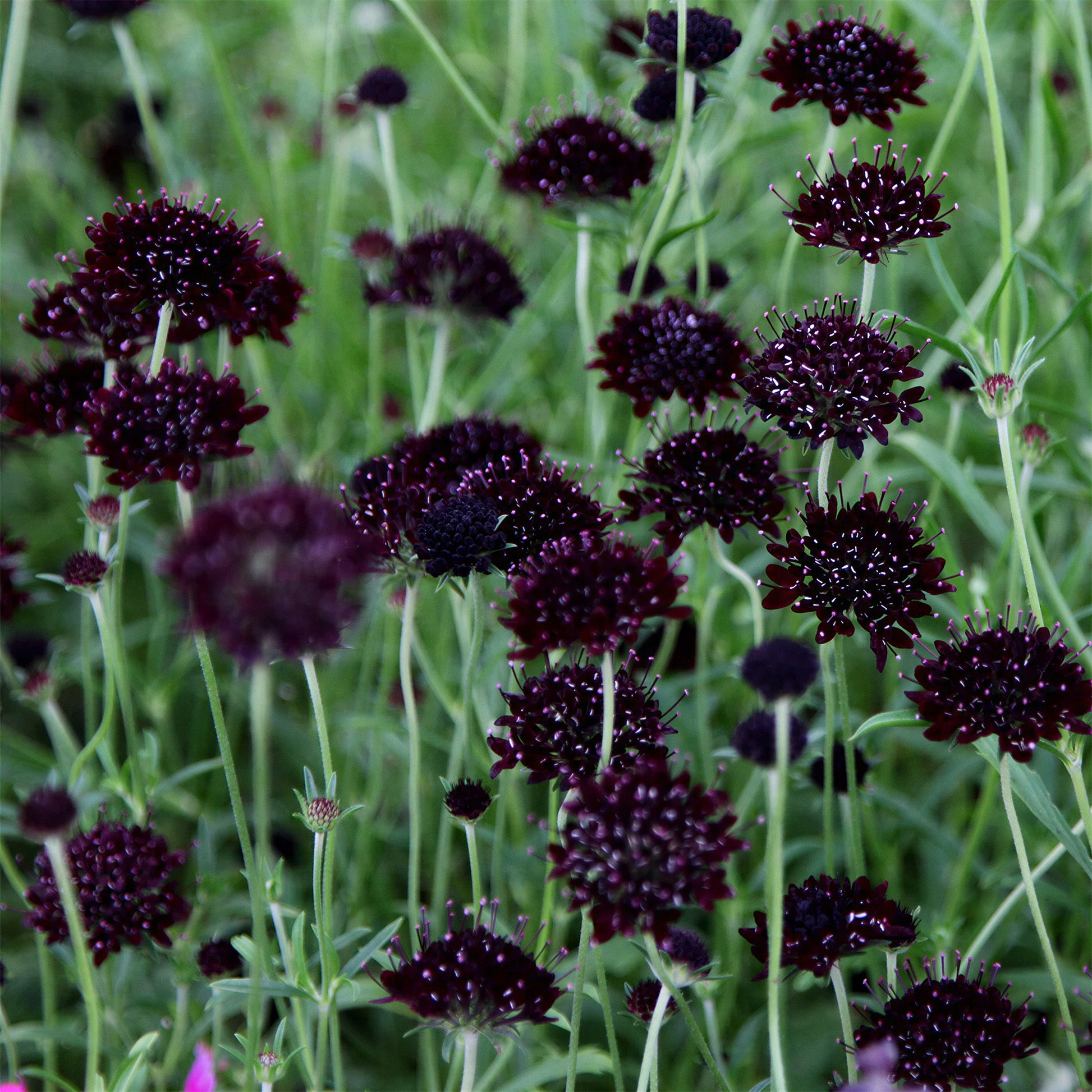 Also known as Sweet Scabious, Scabiosa 'Black Knight' is a bold and romantic variety that commands attention with its deep, velvety maroon, almost black, blooms. These pincushion-like flowers rise gracefully on slender stems, adding a touch of gothic elegance to summer borders, wildflower meadows, and floral arrangements. Their rich colour contrasts beautifully with their white stamens, creating depth and drama in any planting scheme.