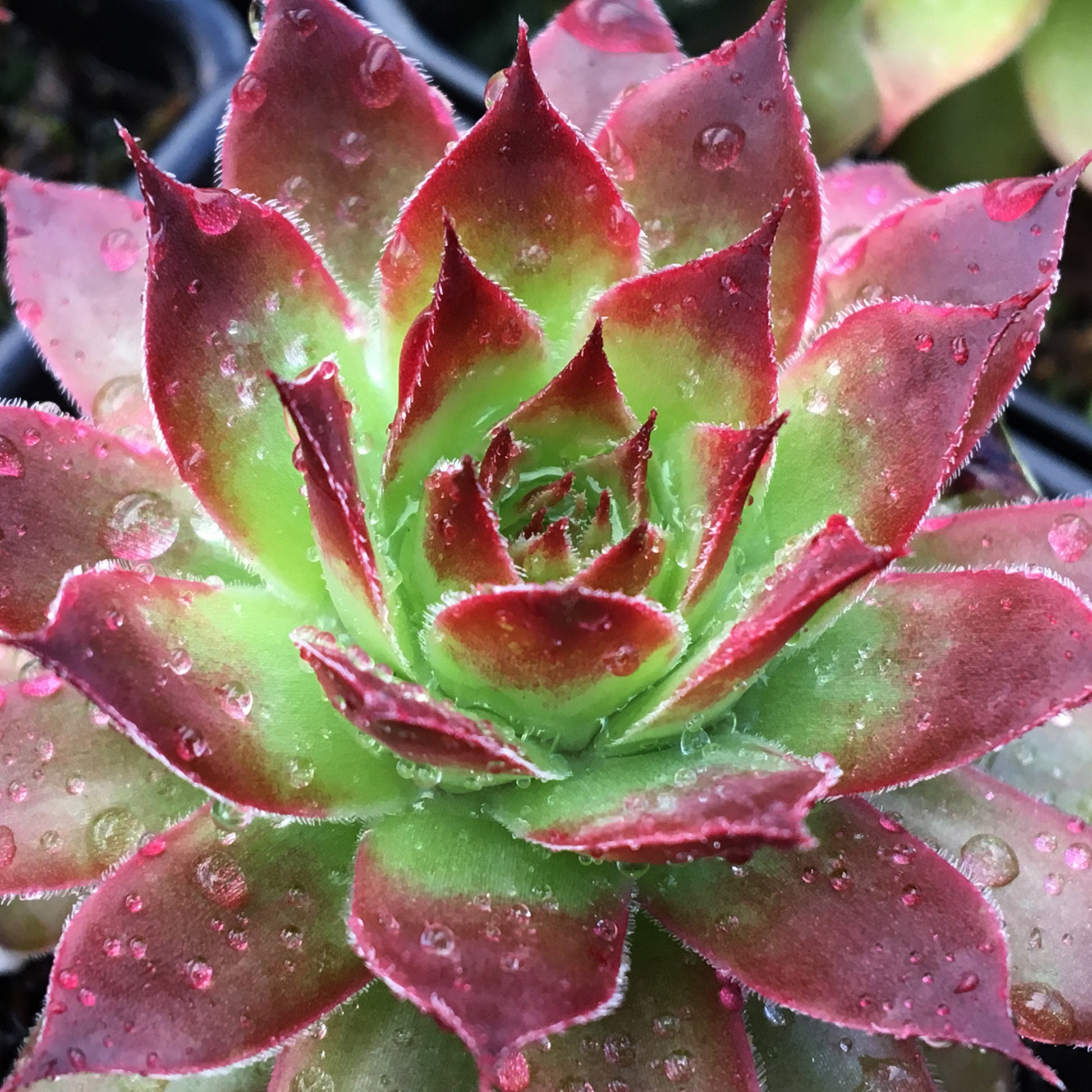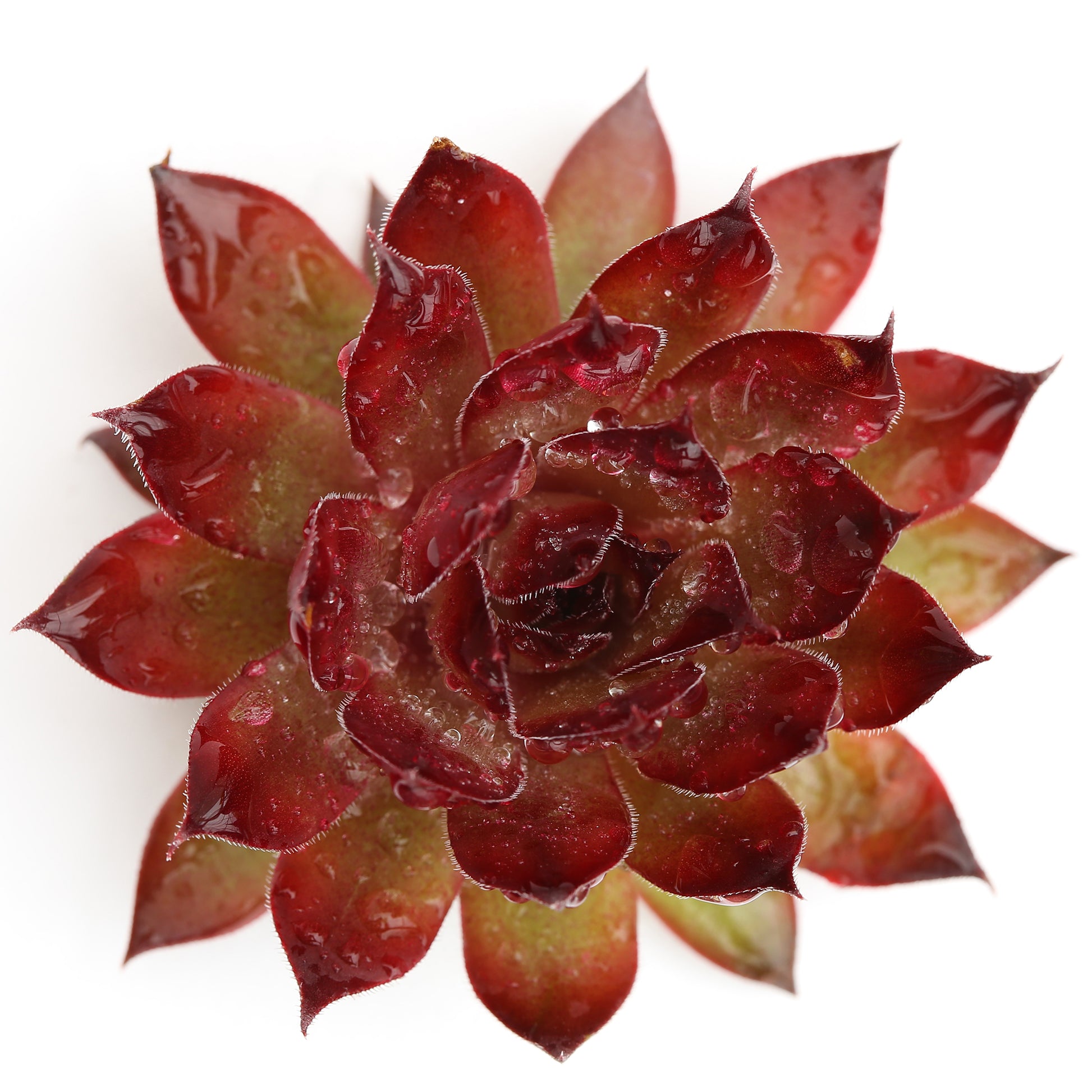 Sempervivum Strawberry Kiwi is an evergreen succulent plant with rounded foliage that has a deep red colour filling the visual appearance of it. Each leaf forms to a tip at the peak of each leaf, with small tinges of green colour ensuring that there is a good mix of different shades within the succulents look. It is great when placed in garden borders, rockeries and pots. Sempervivum plants should be cared for by planting them in moist, well-drained soil and keeping them placed in full sunlight. Water will be stored well through the plants thick leaves, making occasional watering an ample amount for this to thrive.