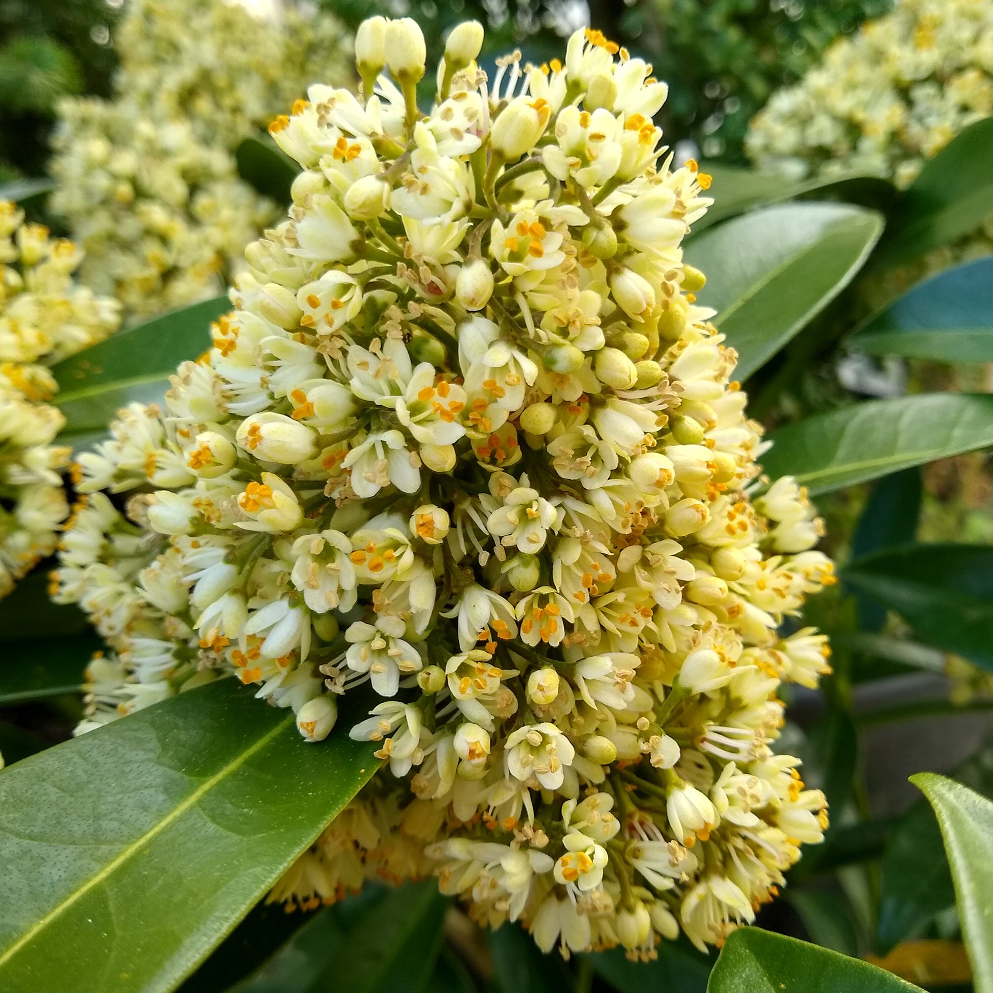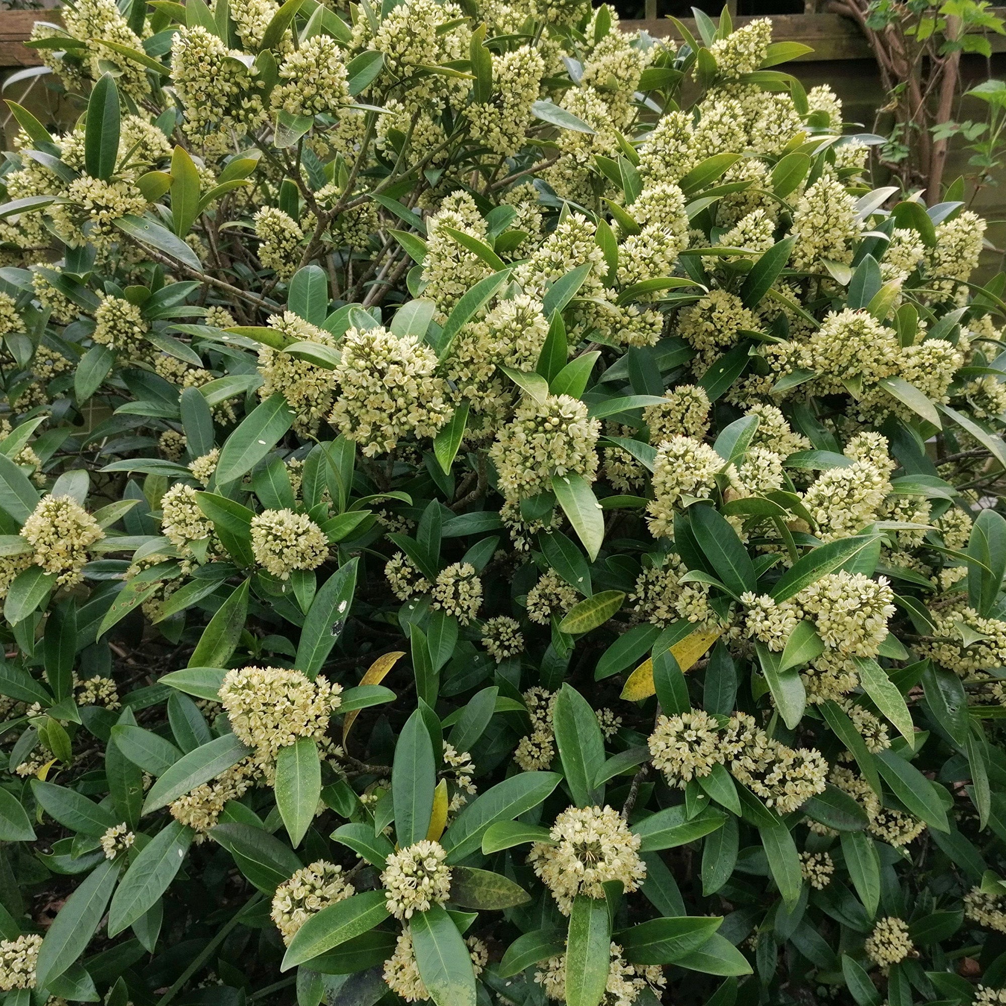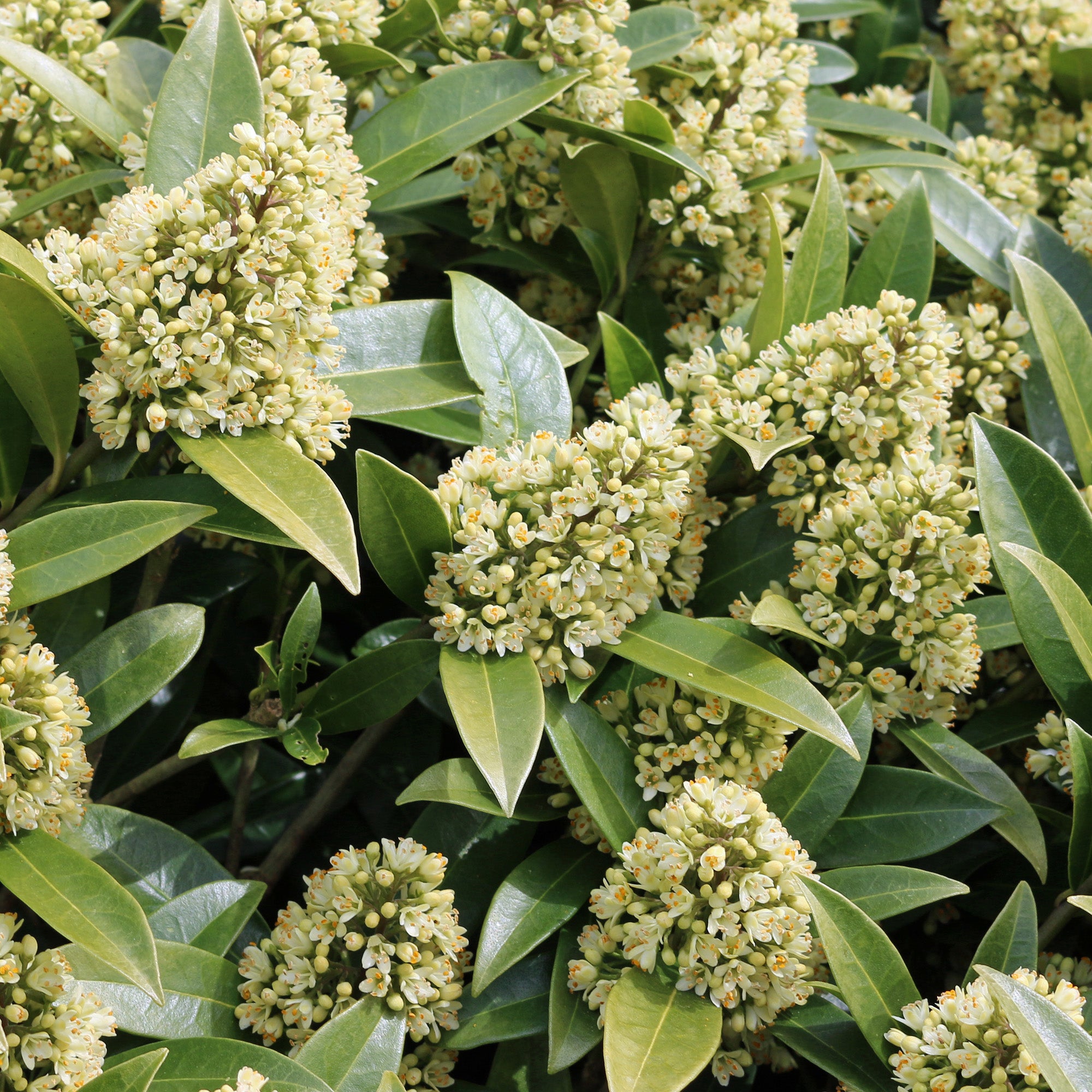 Skimmia 'Kew Green' is a fantastic architectural evergreen shrub, grown for its magnificent floral display. This is a male variety, so it does not produce berries. Instead, its main feature is the huge, domed clusters of highly fragrant, greenish-white flowers that create a spectacular show. The prominent flower buds provide interest for many months before they open, making it a brilliant plant for year-round structure.
