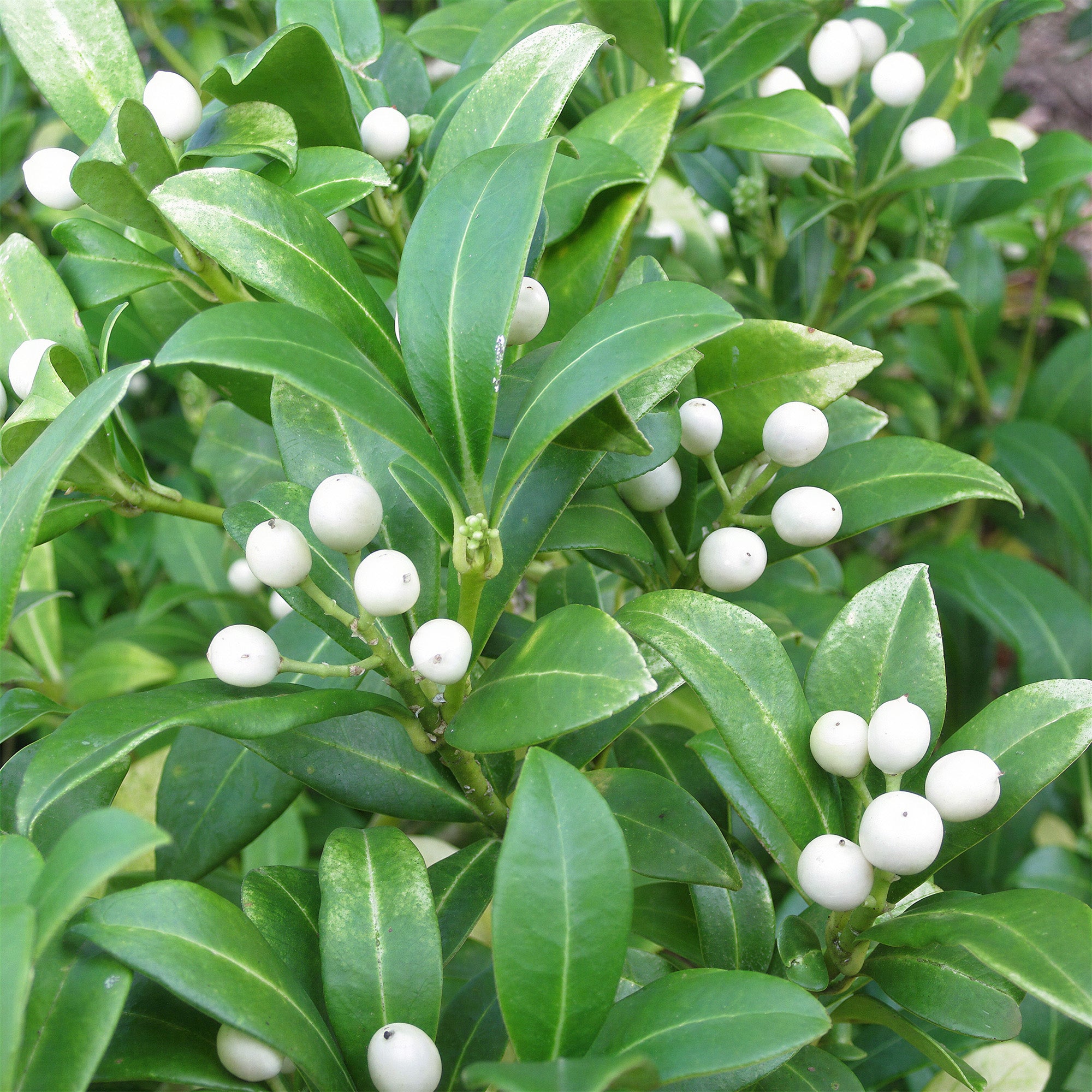 To get the beautiful and unusual white berries that make this Skimmia Kew White female variety so special, you must have a male Skimmia (like 'Finchy' or 'Kew Green') planted somewhere in the same garden to provide pollination.