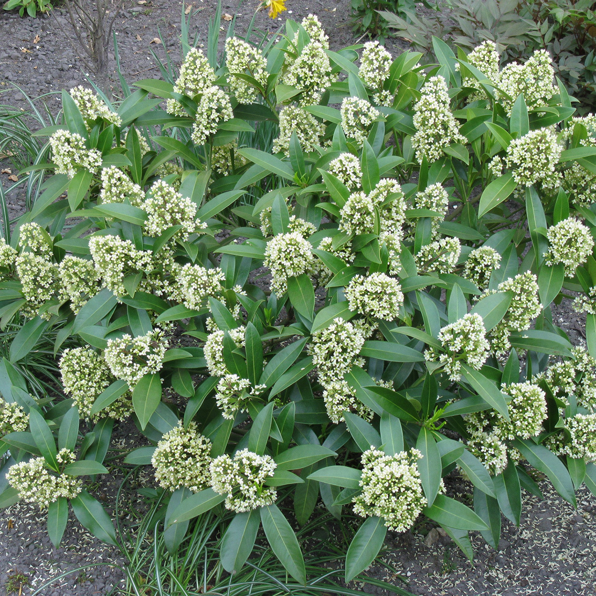 For your Skimmia Kew White to thrive, plant it in moist, well-drained, slightly acidic soil, ensuring the top of the root ball is level with or slightly above the surrounding ground. Water deeply and regularly during its first growing season to establish its roots, and apply a layer of mulch to help retain moisture.