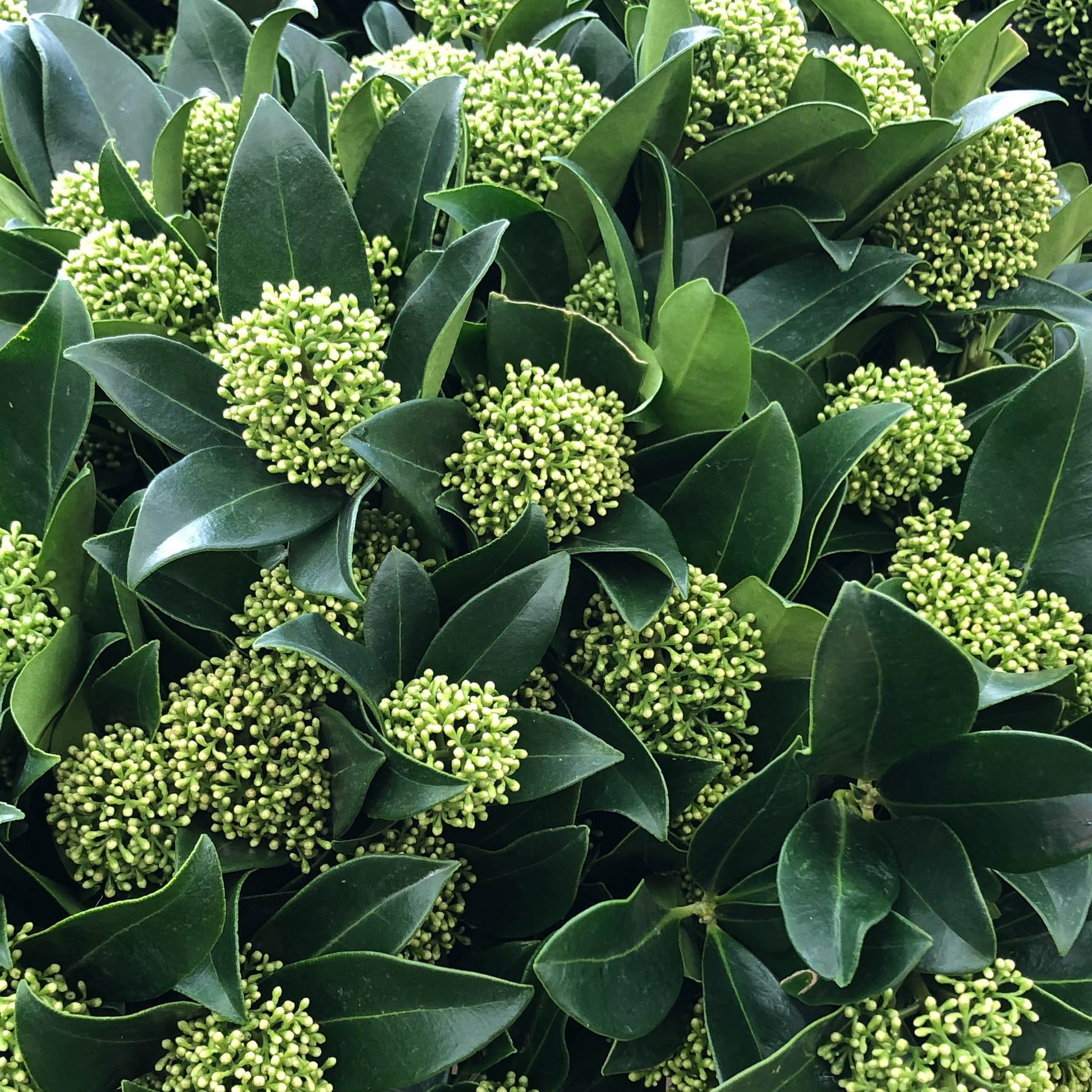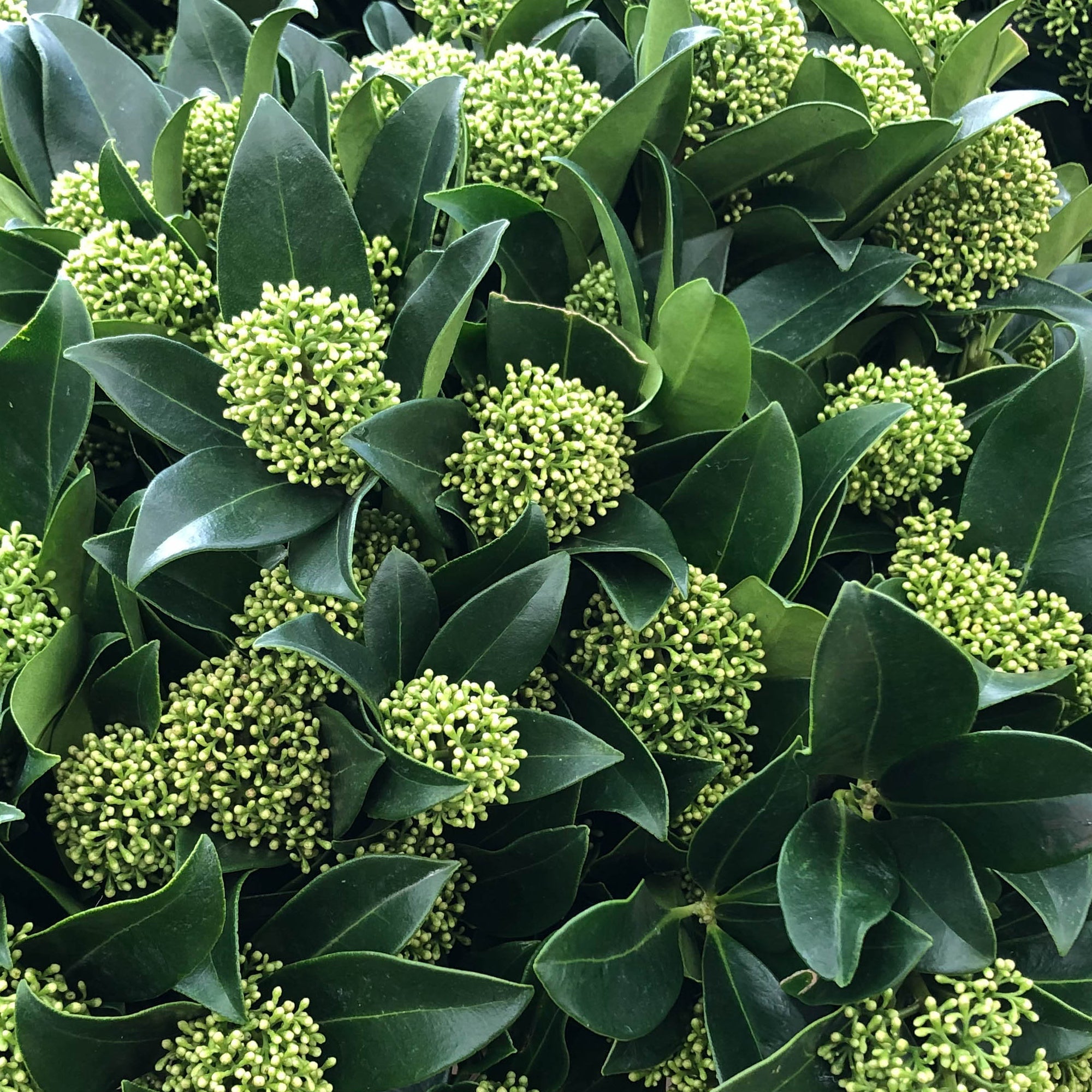 Skimmia thrives in shaded areas and can be used as an evergreen hedge or ground cover. To promote healthy growth, prune dead or damaged stems after flowering.