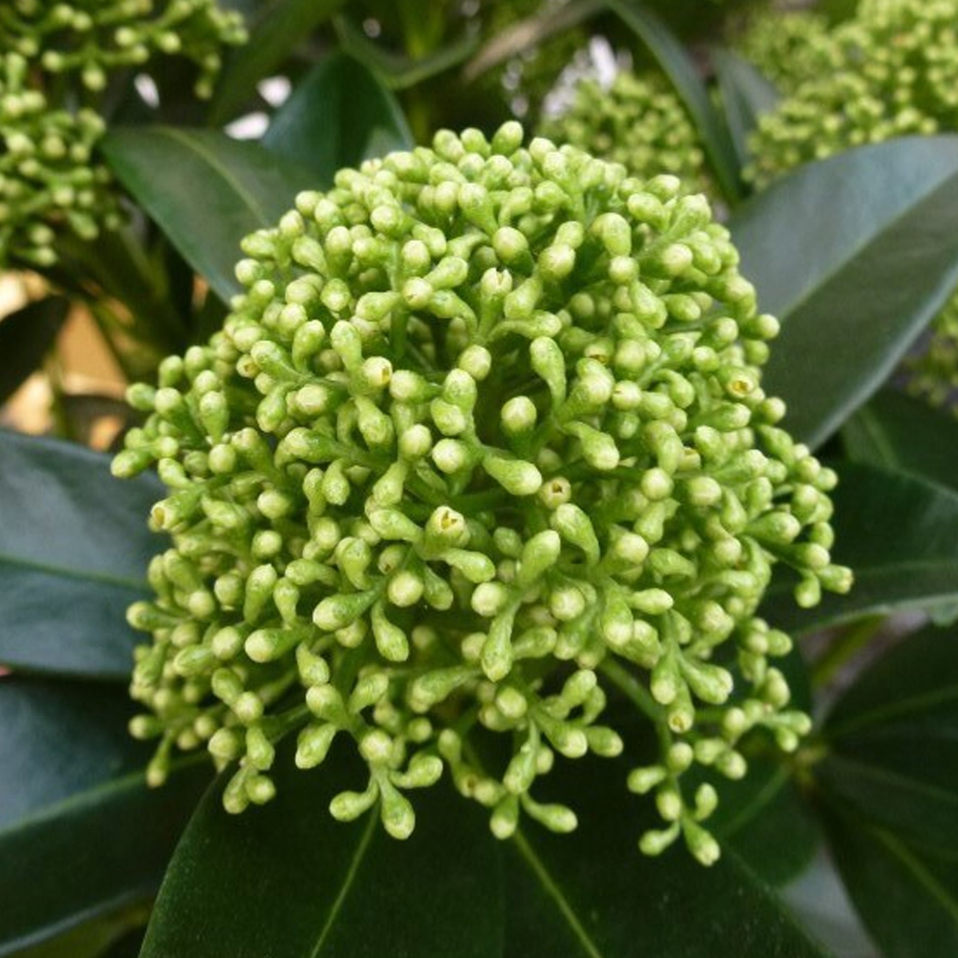 Skimmia japonica White Globe is am evergreen garden shrub with a cleanly appearance about it. The dark green foliage of the plant is kindly offsetted by lime green budding, which is then followed by some gorgeous, scented white flowering in March and April. This delightful variety of Skimmia will bring a vast amount of neat colour and style to the garden.
