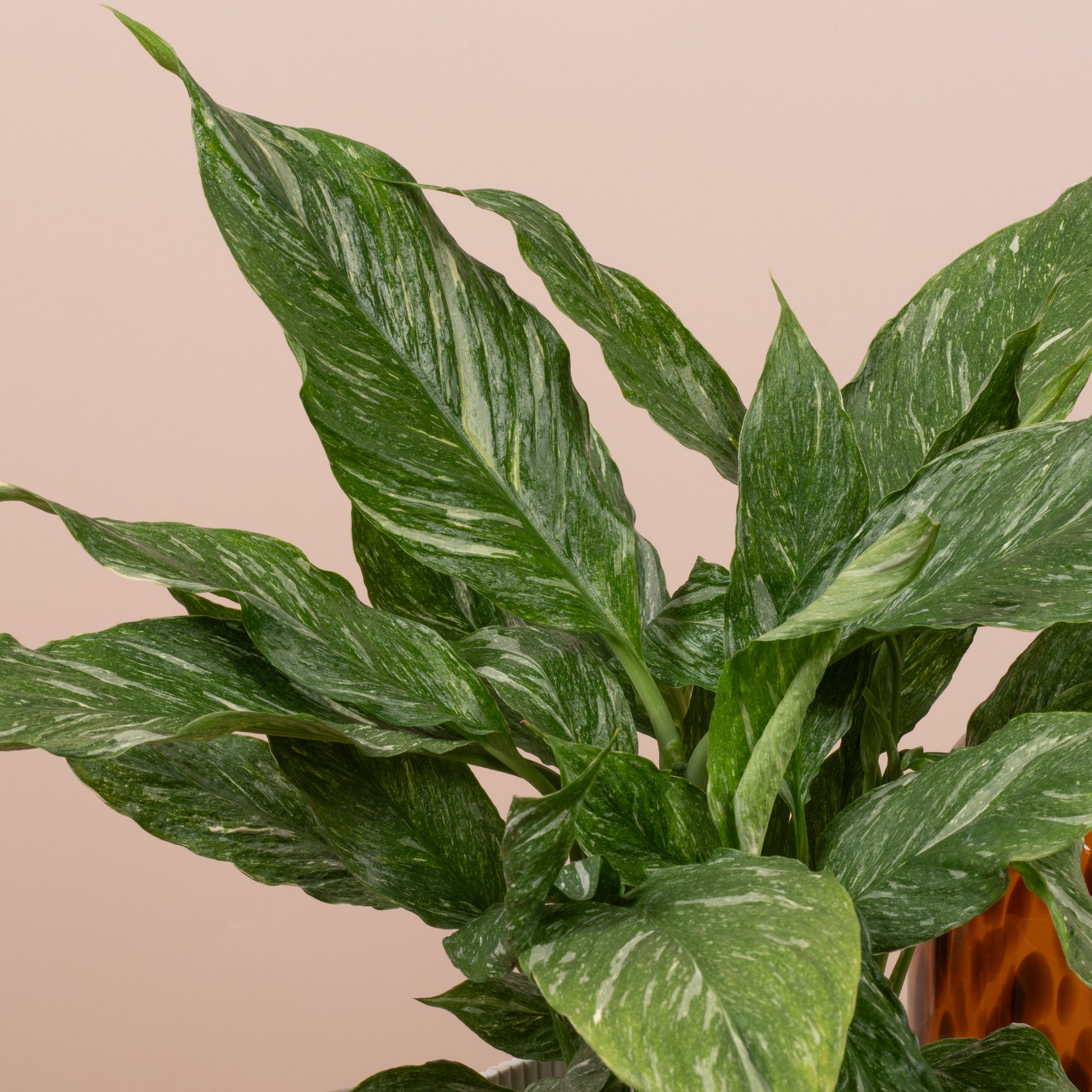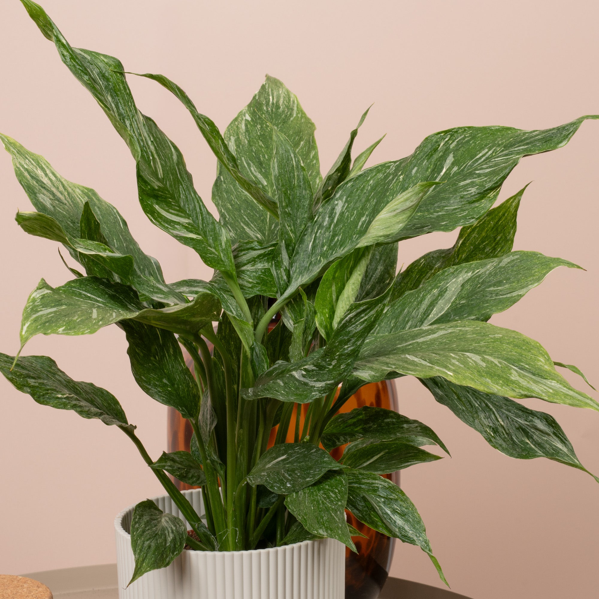 Spathiphyllum Diamond Variegated, also known as the Variegated Peace Lily, is a stunning variegated variety of the classic Peace Lily (Spathiphyllum wallisii). The dark green foliage of this indoor plant is beautifully contrasted by pale marbled variegation, creating an elegant and eye-catching display. This compact, bushy plant thrives in medium light conditions, making it an excellent choice for indoor spaces that need a touch of refined greenery.