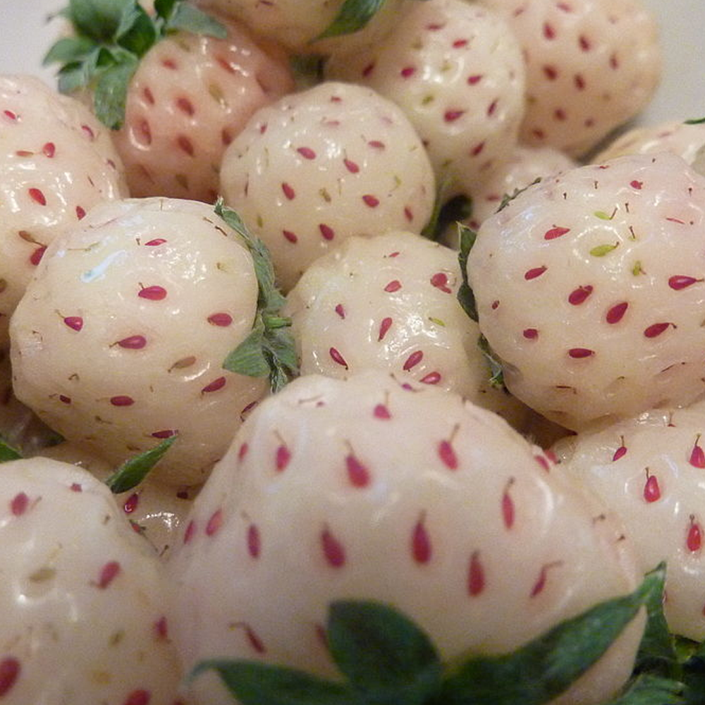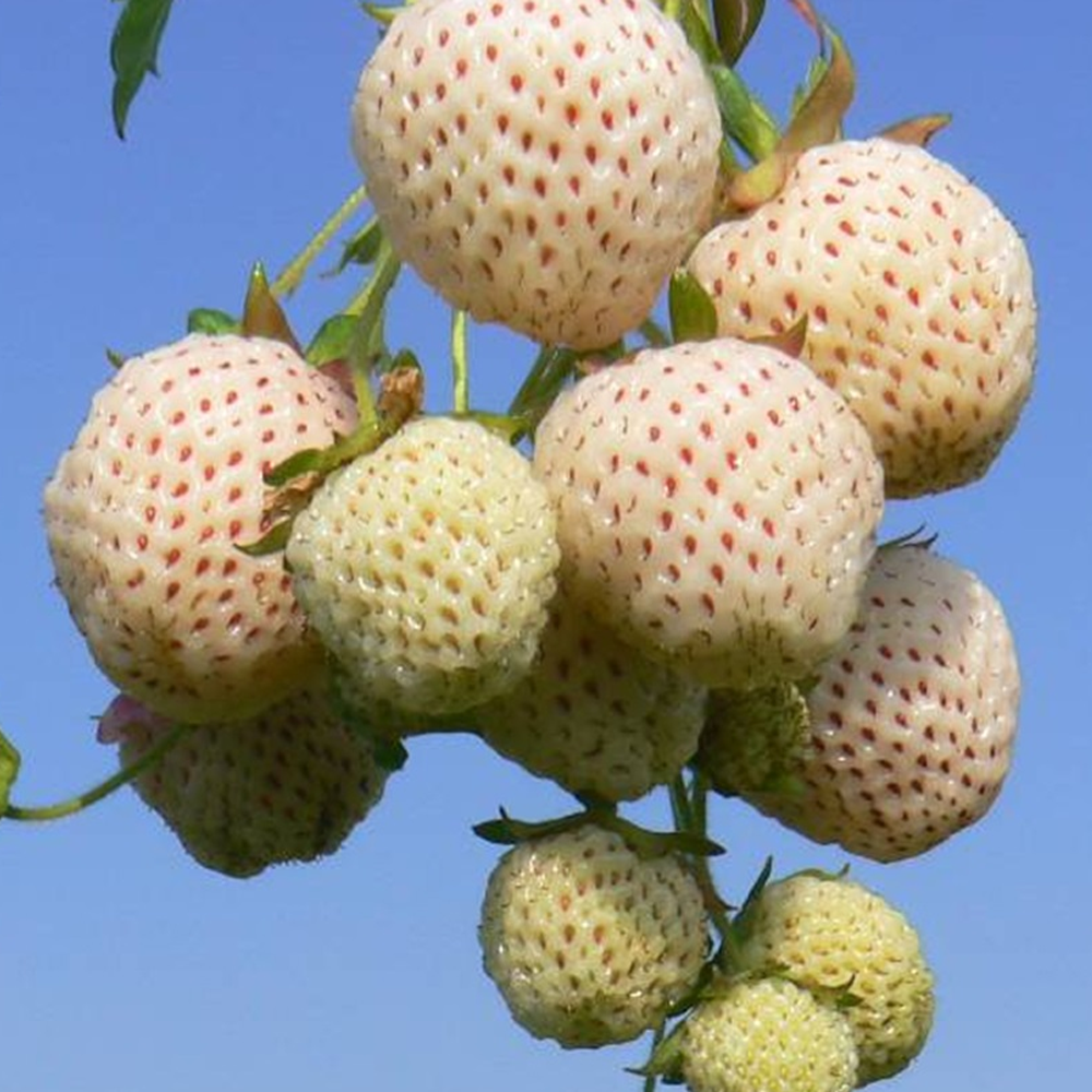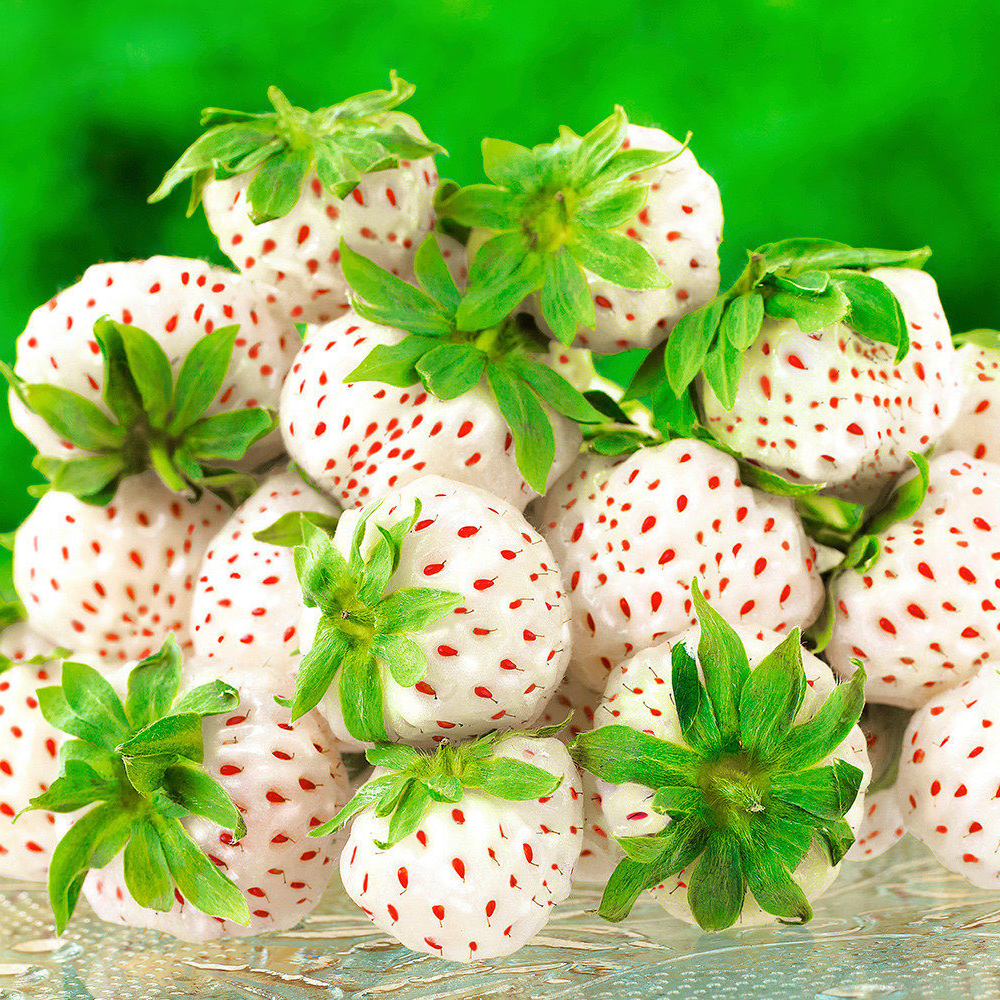 Strawberry ‘Snow White’ is a mid-season fruiting bare root strawberry producing a heavy cropping of signature reversed colour berries, which start off green and mature into white with small, red seeds on the surface. ‘Snow White’ possesses a strong scent and an interesting flavour which is likened to pineapple. Its white colour also makes it less attractive to birds, which normally search for more colourful fruits and berries.