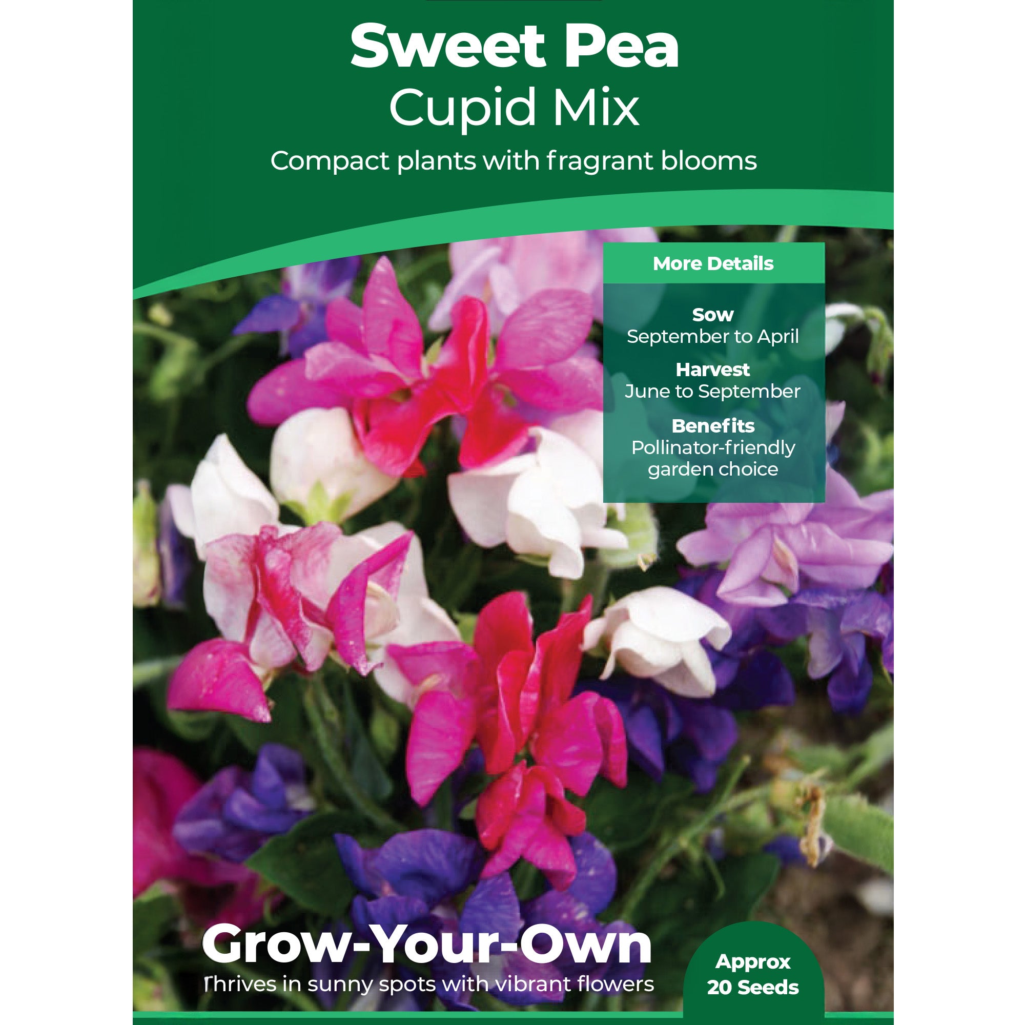 This Cupid mix produces an attractive summer display of dwarf Sweet Peas. These blooms are highly fragrant and are ideal for planting up beds, baskets, planters, and pots. Sweet Pea seeds are easy to grow and are fabulous for adding summer colour to the garden or patio.