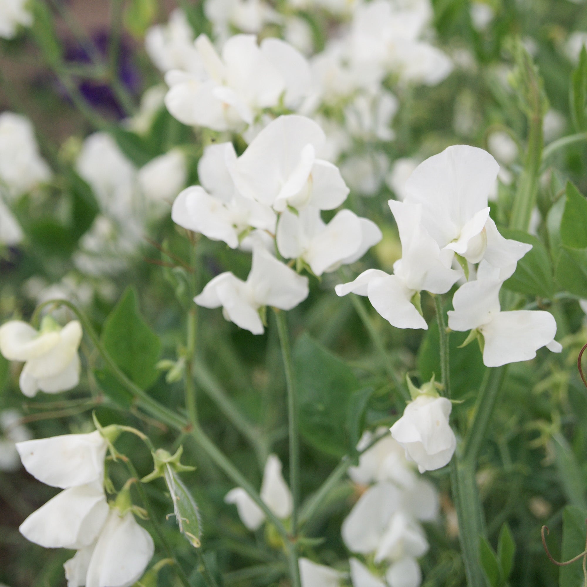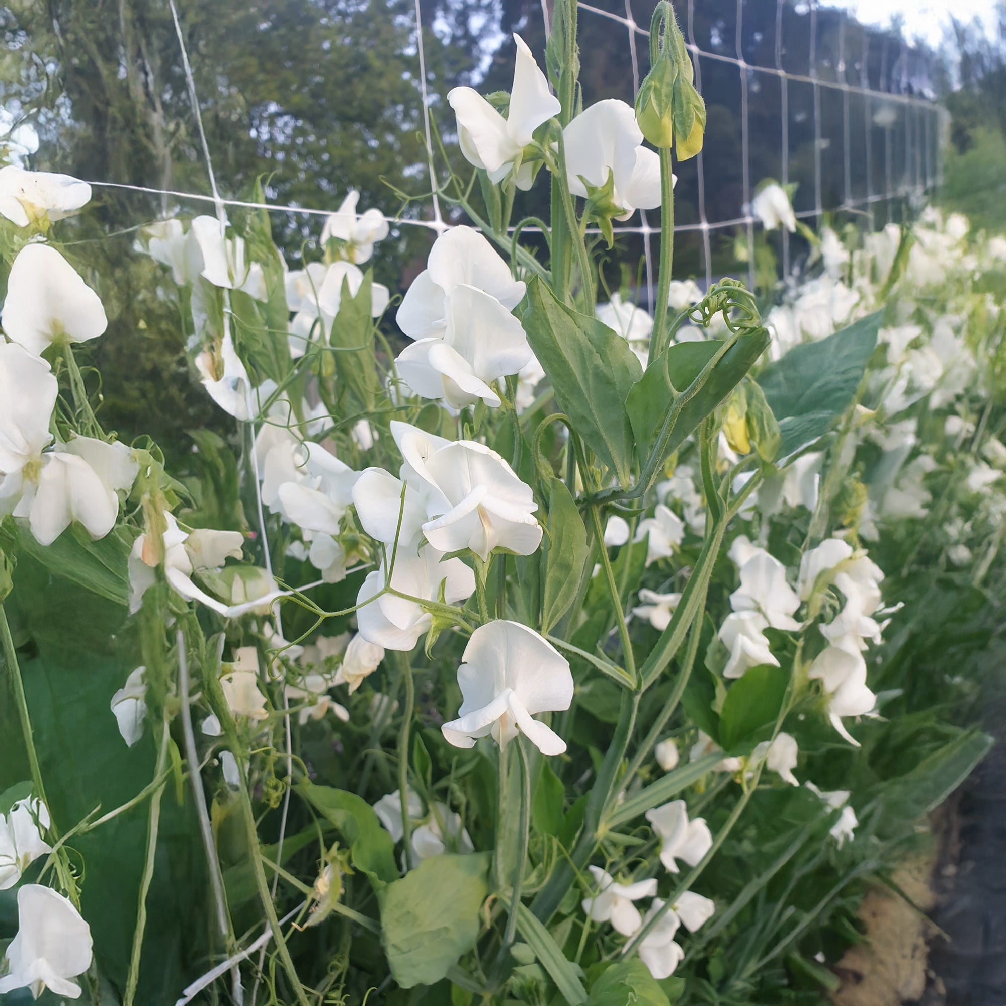 Being climbing plants, White Ensign Sweet Peas benefit from a support in the form of a trellis or obelisk to scramble up. They are easy to grow, preferring a sheltered spot in full sun in well-draining soil. Water well after planting and during dry spells to keep the soil evenly moist but not waterlogged. Pinch the tips of young plants to promote bushy growth and an abundance of flowers and deadhead spent blooms to encourage further flowering.