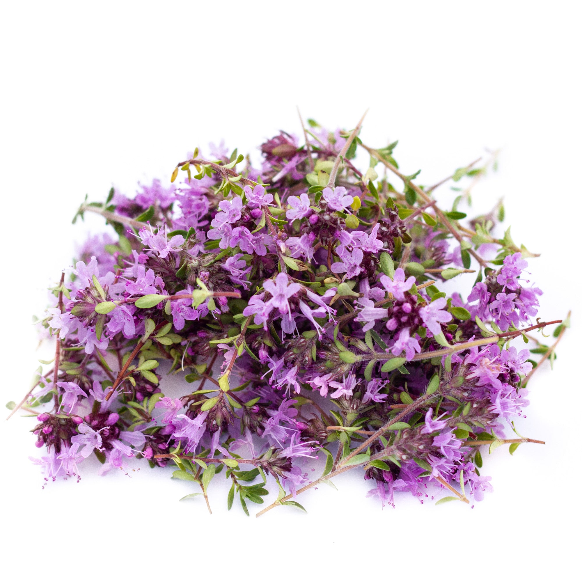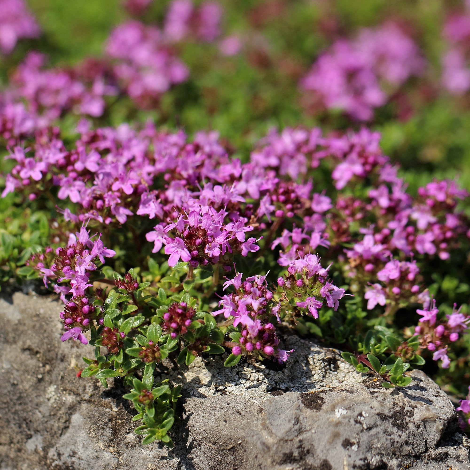 Creeping Thyme is a hardy, mat-forming perennial, perfect for creating a carpet of fragrant, evergreen foliage in the garden. Its low, spreading habit makes it ideal for ground cover, rock gardens, or planting between paving stones where the scent is released when walked upon. In addition to its aromatic leaves, it produces dense clusters of tiny pink or purple flowers that are a magnet for pollinators, proving irresistible to bees.
