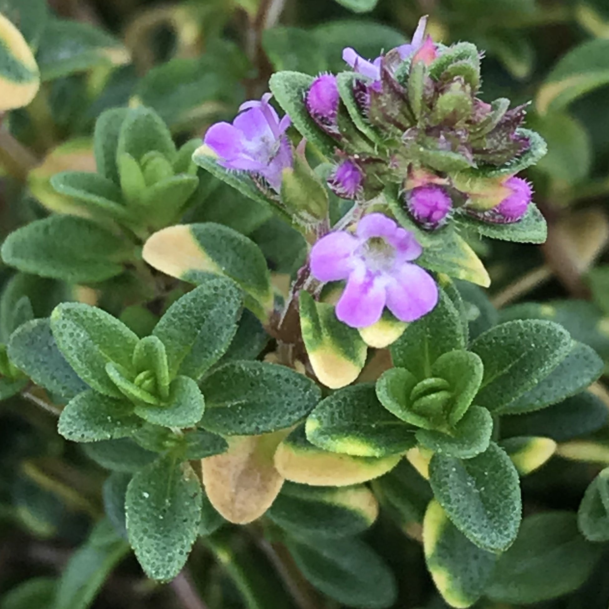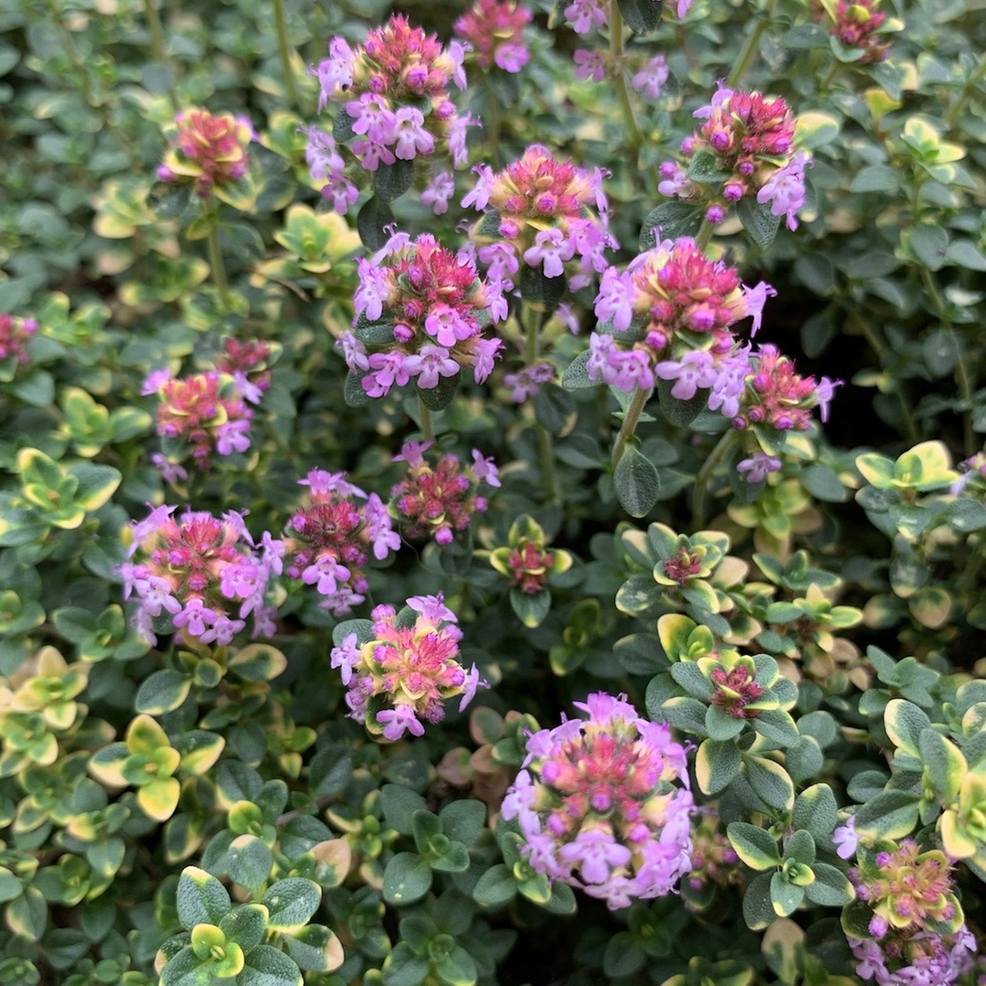 Thyme Doone Valley is a variegated cultivar of lemon thyme, and its glossy dark green leaves are dotted with shades of creamy gold. In summer, the plant is crowned with clusters of small light purple flowers. Like other varieties of lemon thyme, Doone Valley is highly aromatic, with a citrussy scent that spreads through the garden when the plant is brushed past.