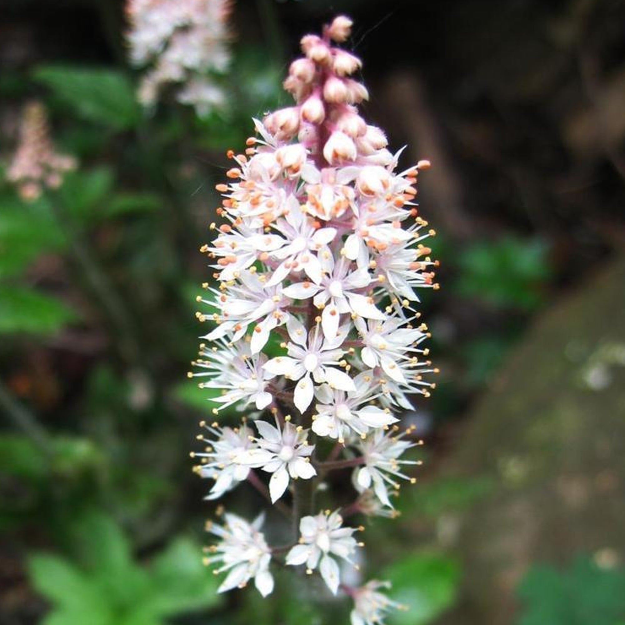 Tiarella ‘Spring Symphony’, sometimes known as Foamflower, is a bright Spring perennial and a great choice for flower borders and groundcover. The large, deeply lobed or cut leave are mid-green with deep purple central colouration along the midribs. Stems bearing conical flowers spikes appear from Spring carrying small, pale pink buds which open into star-shaped cream-white blooms from late Spring through to Summer.