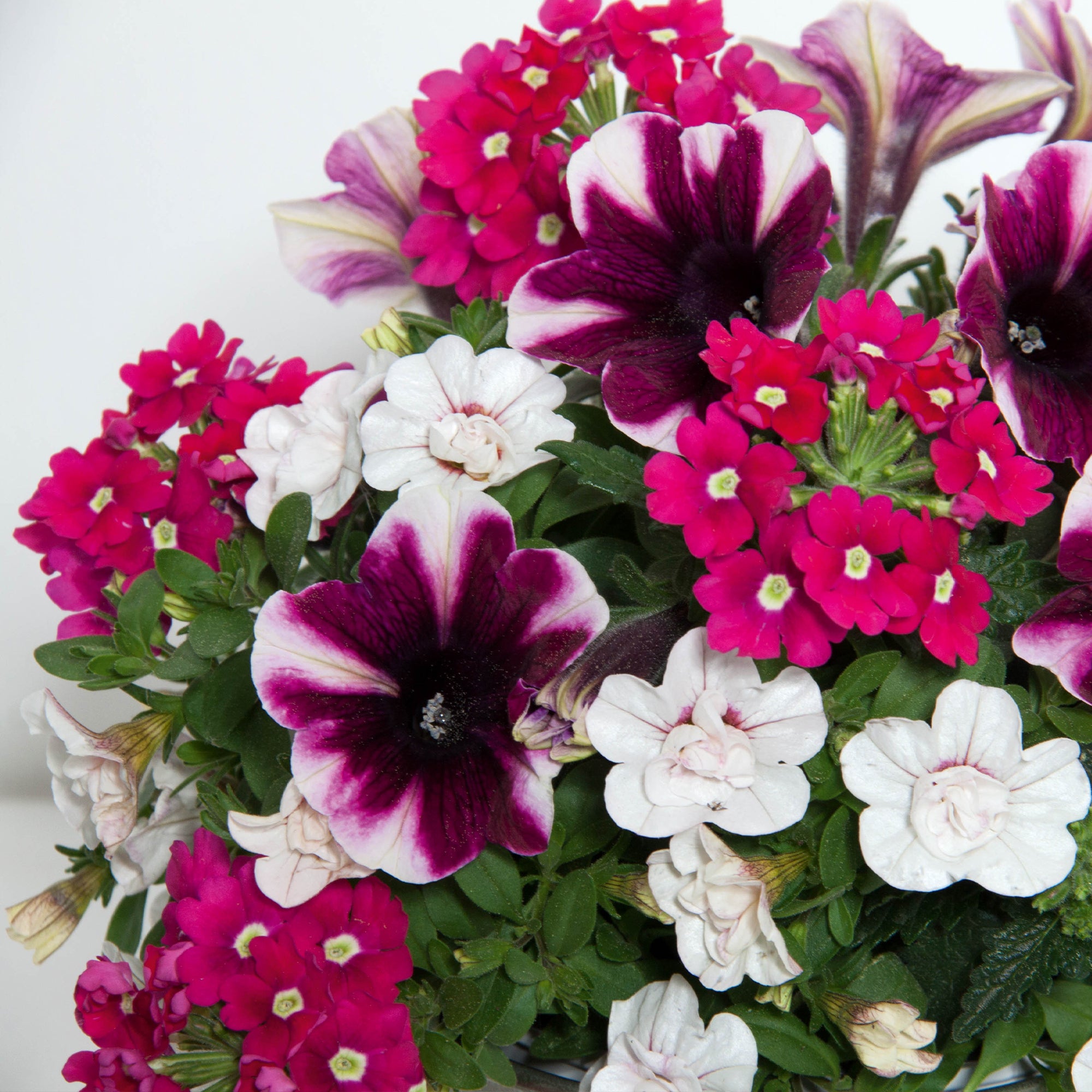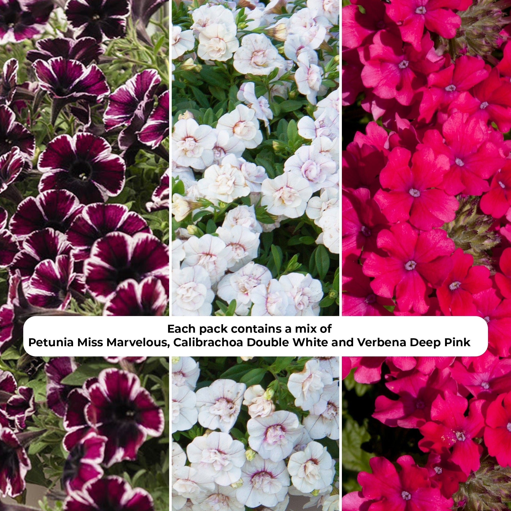 Varieties included in this trio: Petunia Miss Marvelous, Calibrachoa Double White and Verbena Deep Pink.