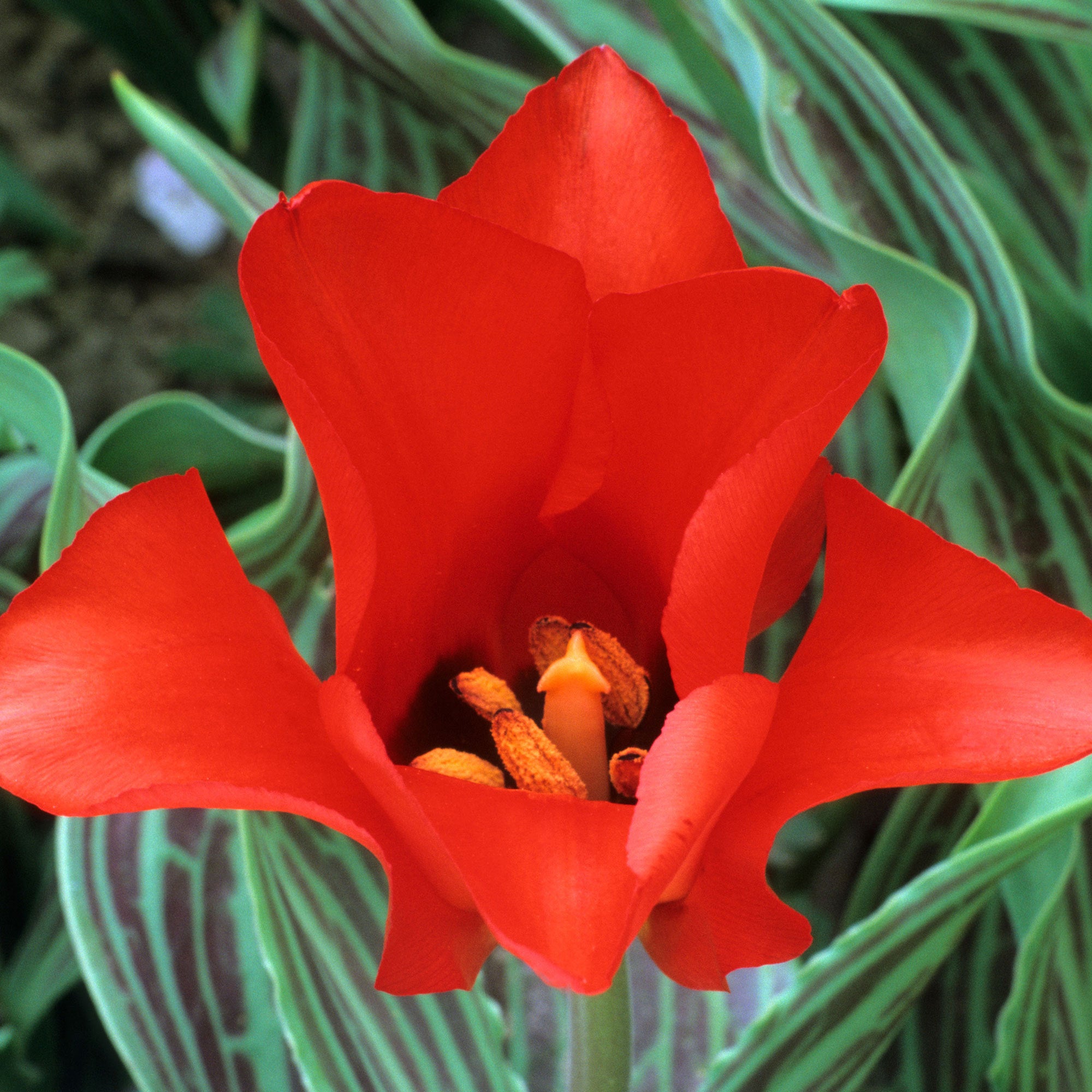 'Red Riding Hood' is a compact tulip growing to 20cm in height, with purple-marked leaves and large, solitary flowers, bright scarlet inside with a black base, deeper red outside.