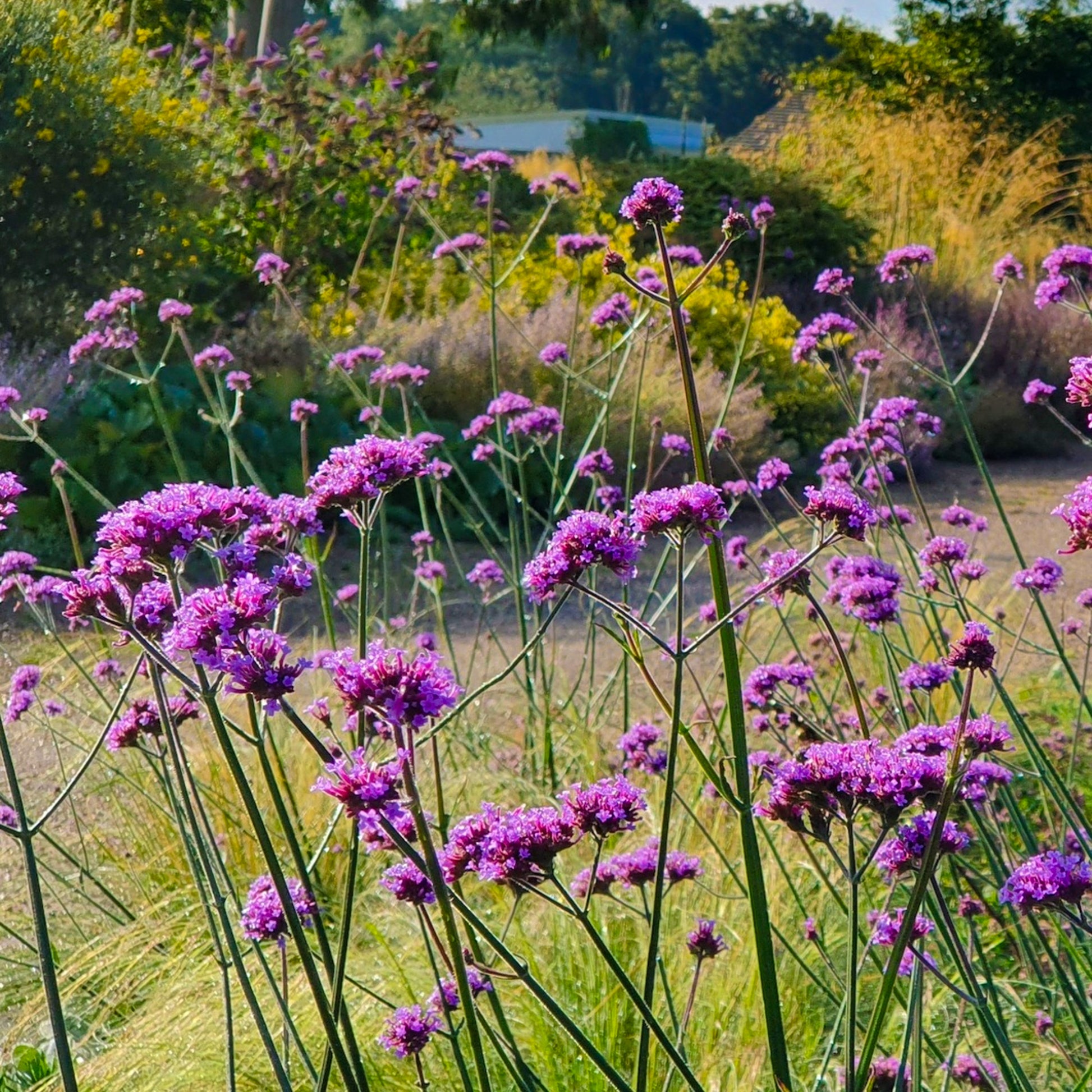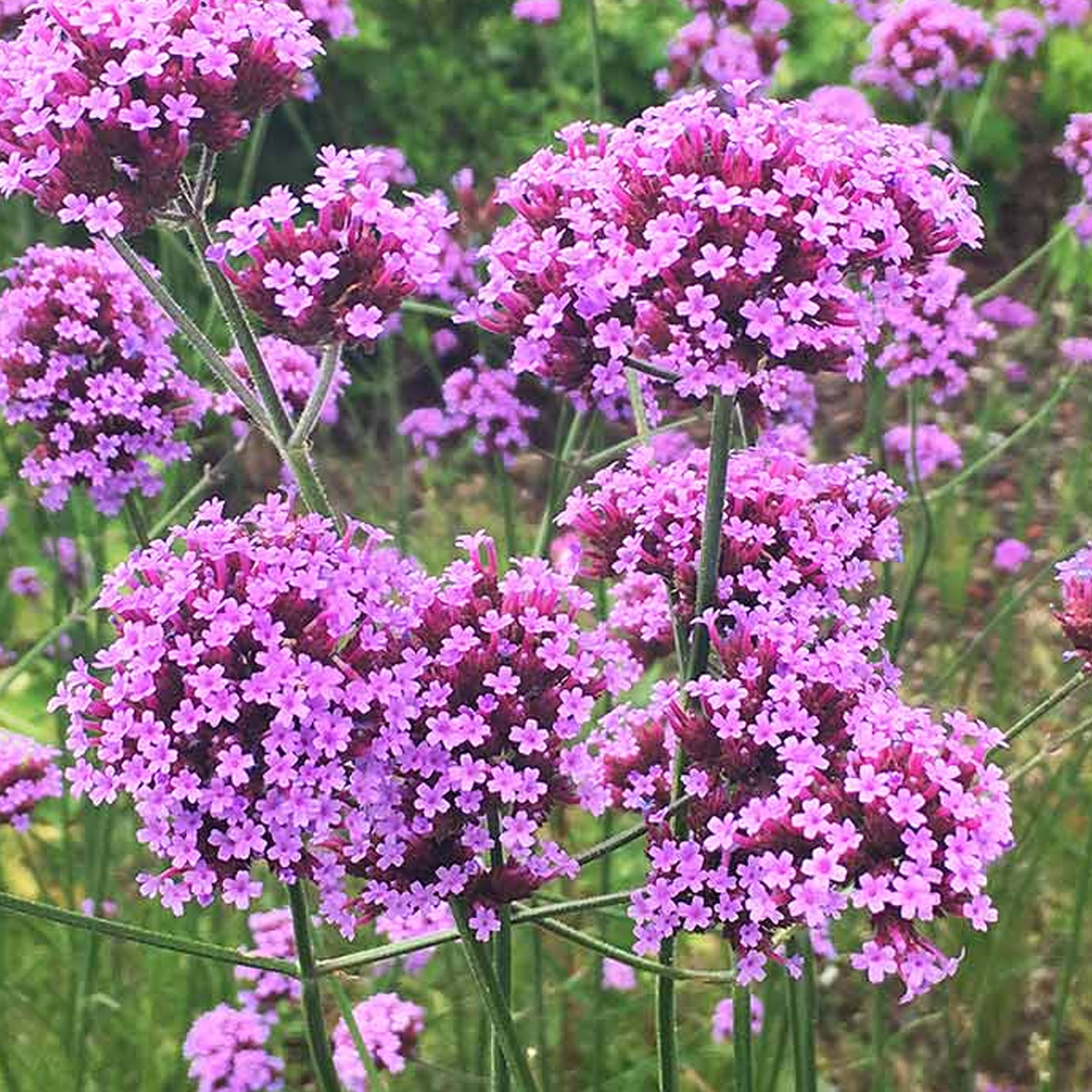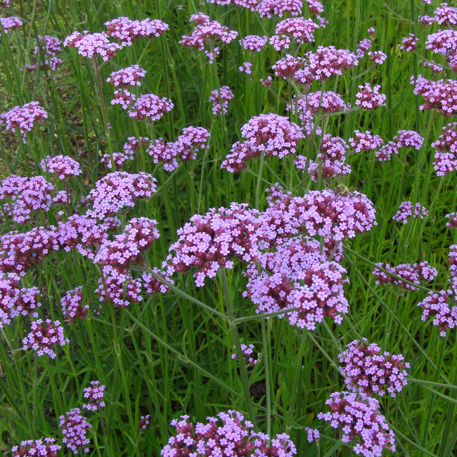 An upright perennial with tall, branching stems reaching high, topped with tight, flat flower clusters. The Verbena bonariensis, or Argentinian Vervain, is a columnar perennial up to 2m with sparse, oblong mid-green leaves nearer to the base of the high rising stems which split to carry terminal clusters of small purple-pink flowers from mid-Summer.