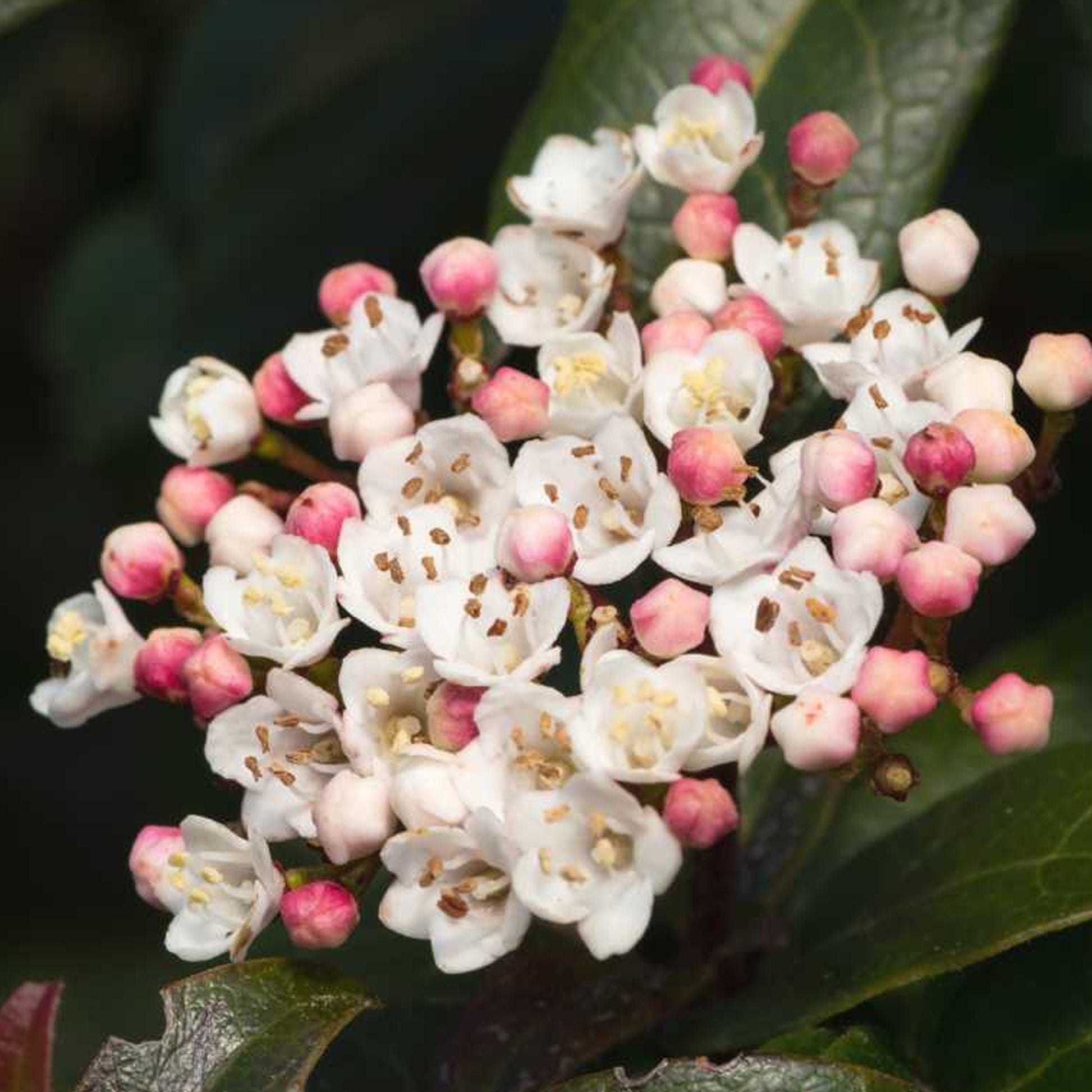 Viburnum 'Lisarose' is a dense, bushy, evergreen shrub that features dark green leaves and colourful flowers that bloom later in the year. The first buds begin to form in early autumn when the temperature begins to drop, these flower buds turn brick-red before blooming from rounded clusters into small pink and white flowers, these flower prolifically from mid-winter to mid-spring, quickly followed by some dark blue berries.