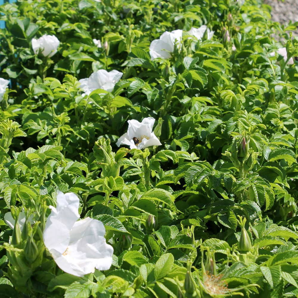 Rosa rugosa Alba will do fine in any type of soil and can be planted inland or in coastal areas. White Ramanus Rose grows at around 1-2 feet per year but can be pruned to a manageable size of 1m high if required.