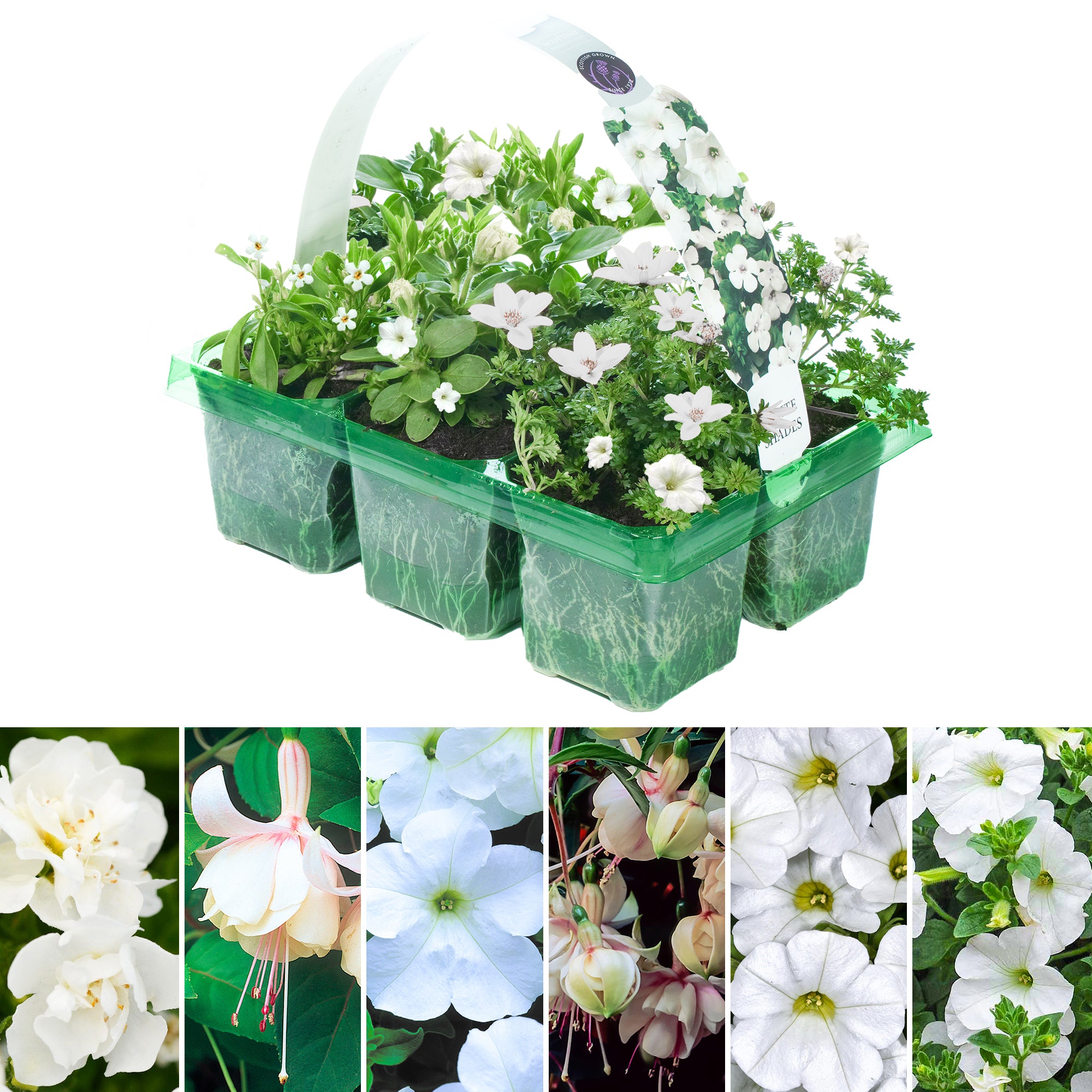 This gorgeous selection of 'White Shades' Basket Plants will provide a stylish and elegant colour to your garden and, on top of that, be easy to care for throughout the year. The plants will flower from late Spring until the end of Summer, only taking a few weeks to thrive and flourish once they're planted. The plants can be utilised as part of a hanging basket display, flower bed, border, pot or garden container. Regular watering should be carried out and a feed every 4-6 weeks is also required.