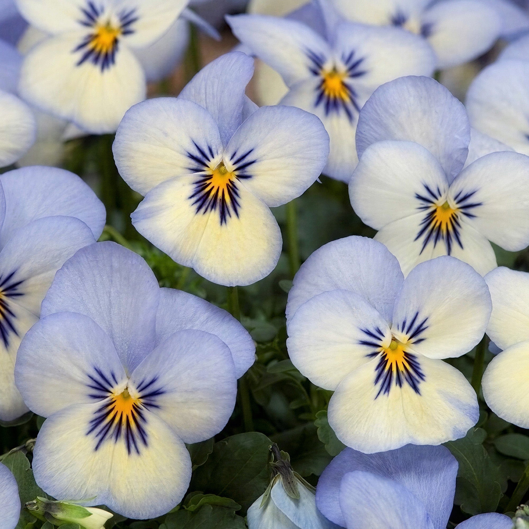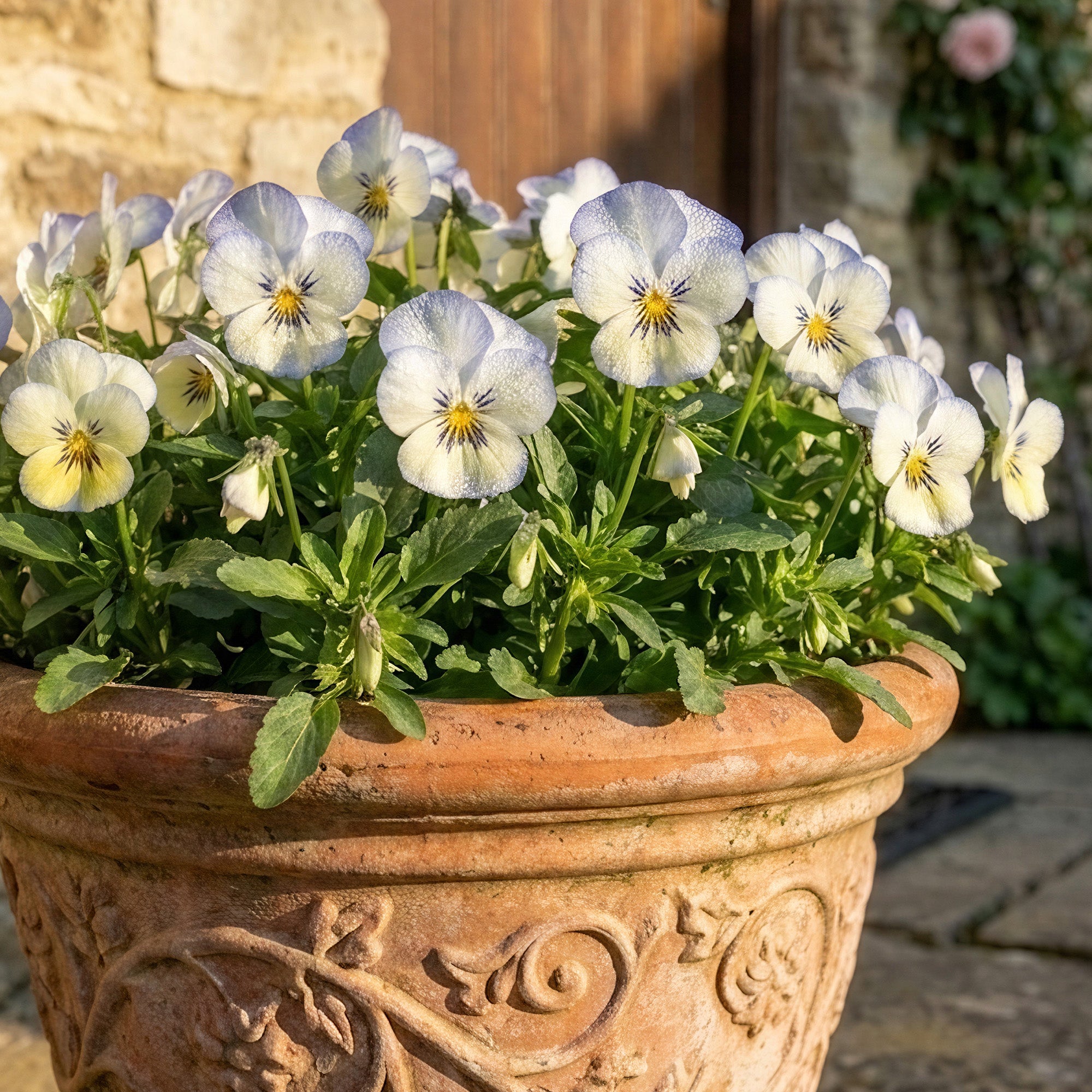 Pair Violas with small evergreen plants (like Ivy or Dwarf Conifers) to give structure and contrast, making the flowers stand out more.
