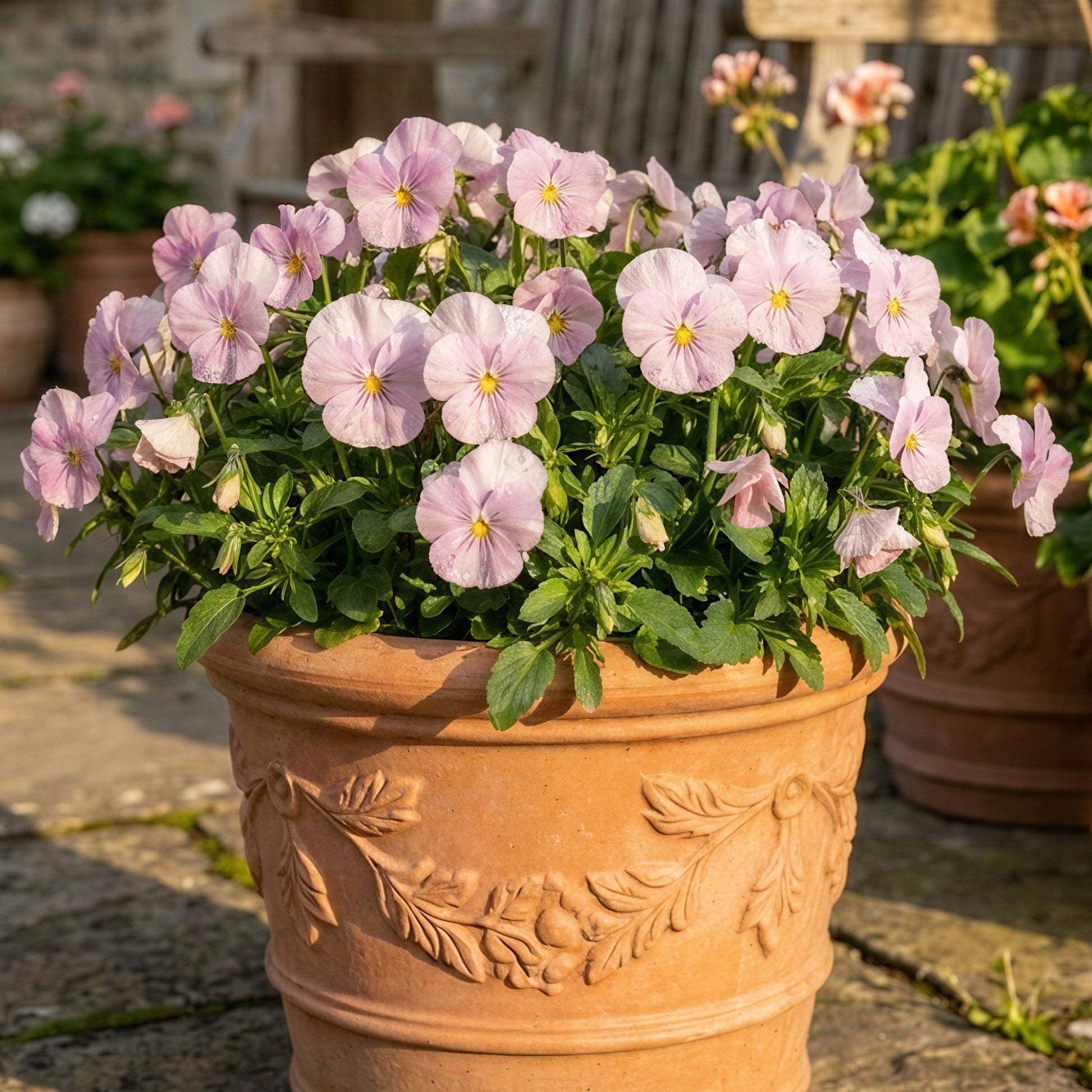 Pair Violas with small evergreen plants (like Ivy or Dwarf Conifers) to give structure and contrast, making the flowers stand out more.