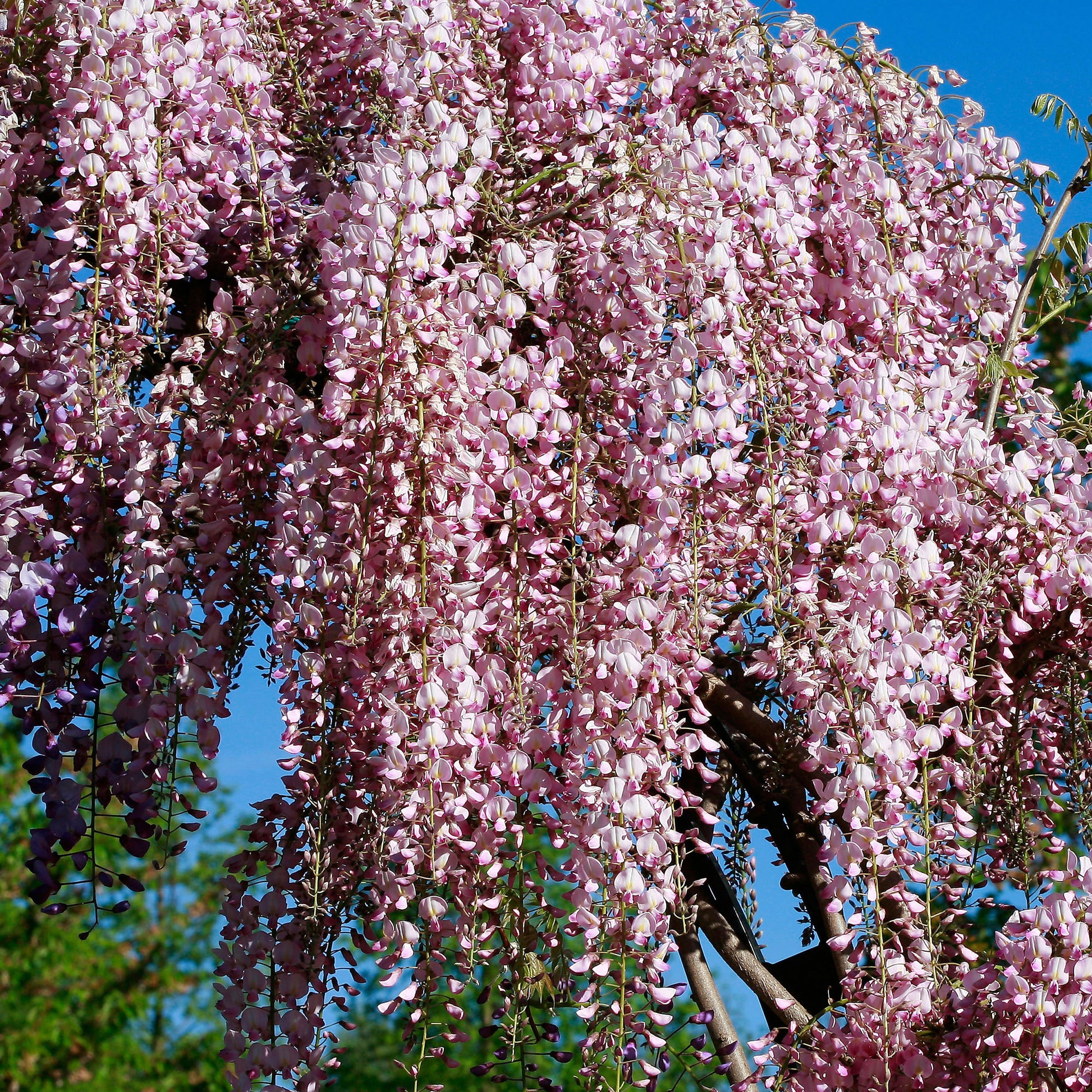 This beautiful Japanese variety brings a touch of soft, romantic colour to the garden, producing an abundance of delicate, pale pink blossoms tipped with vibrant purple. Beyond its gorgeous spring flowers and sweet perfume, it also offers incredible autumn interest when its deciduous leaves turn a brilliant, golden yellow. It is a massive, fast-moving climber that demands respect and a solid framework.