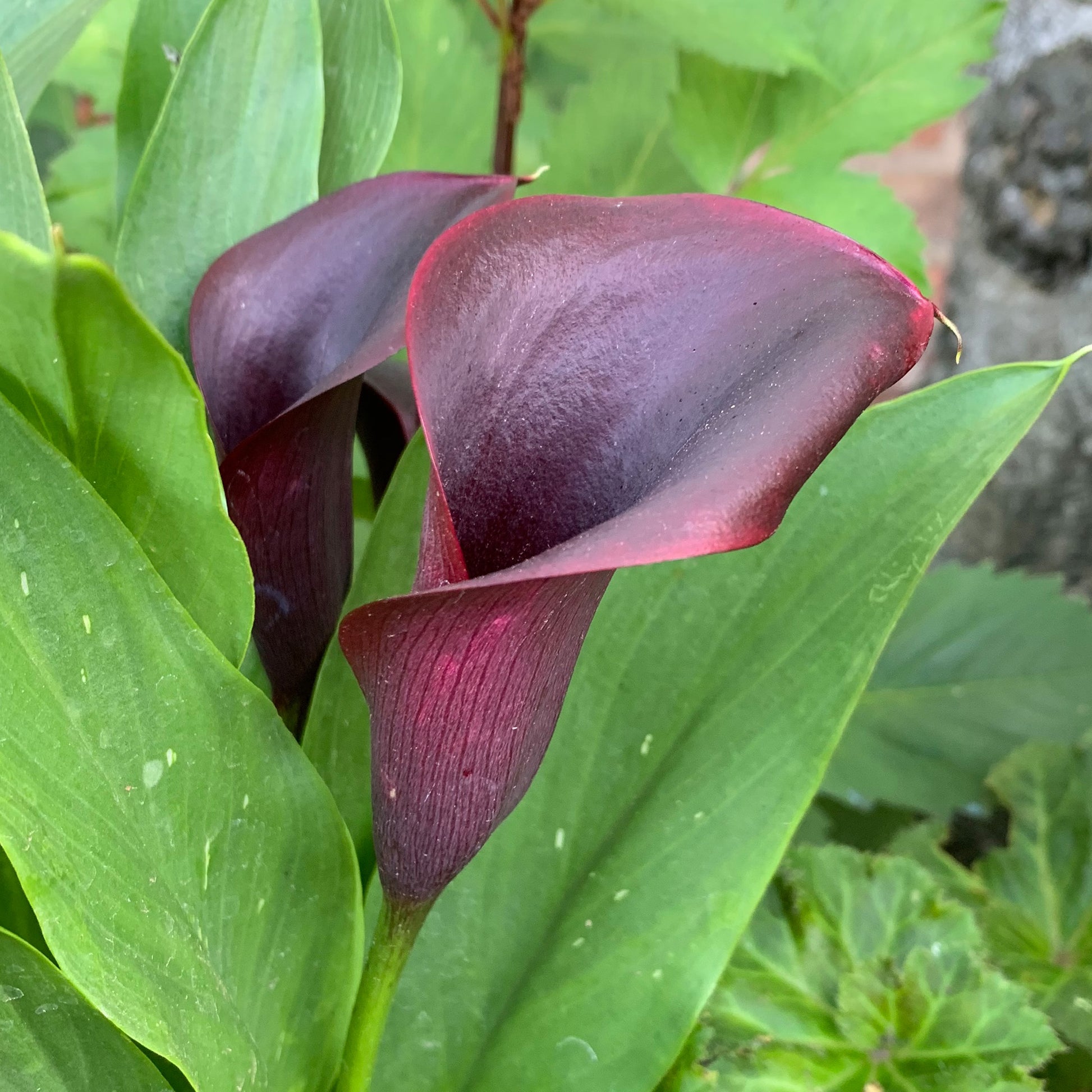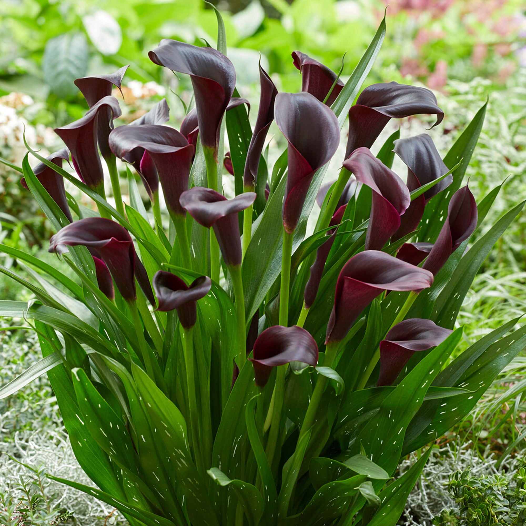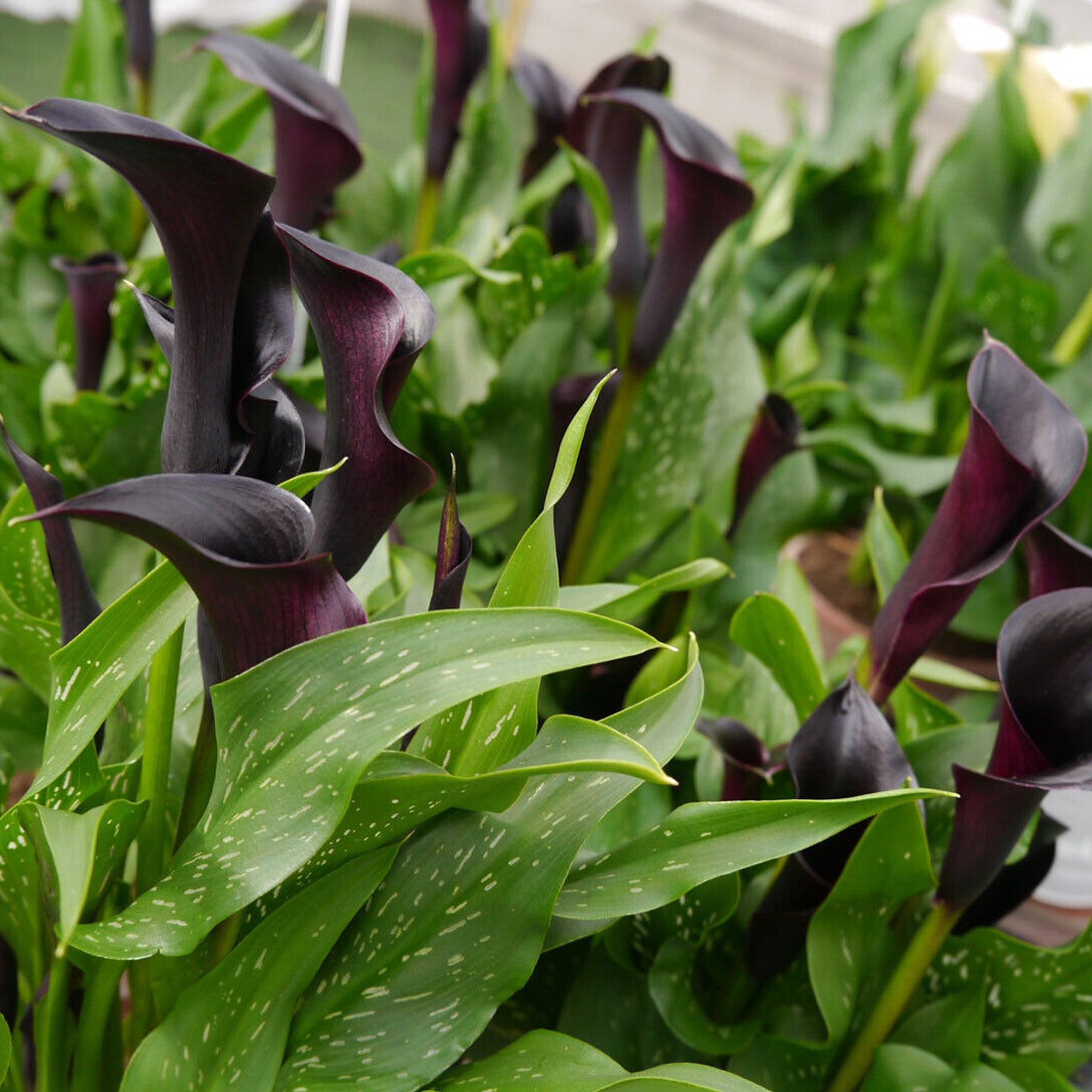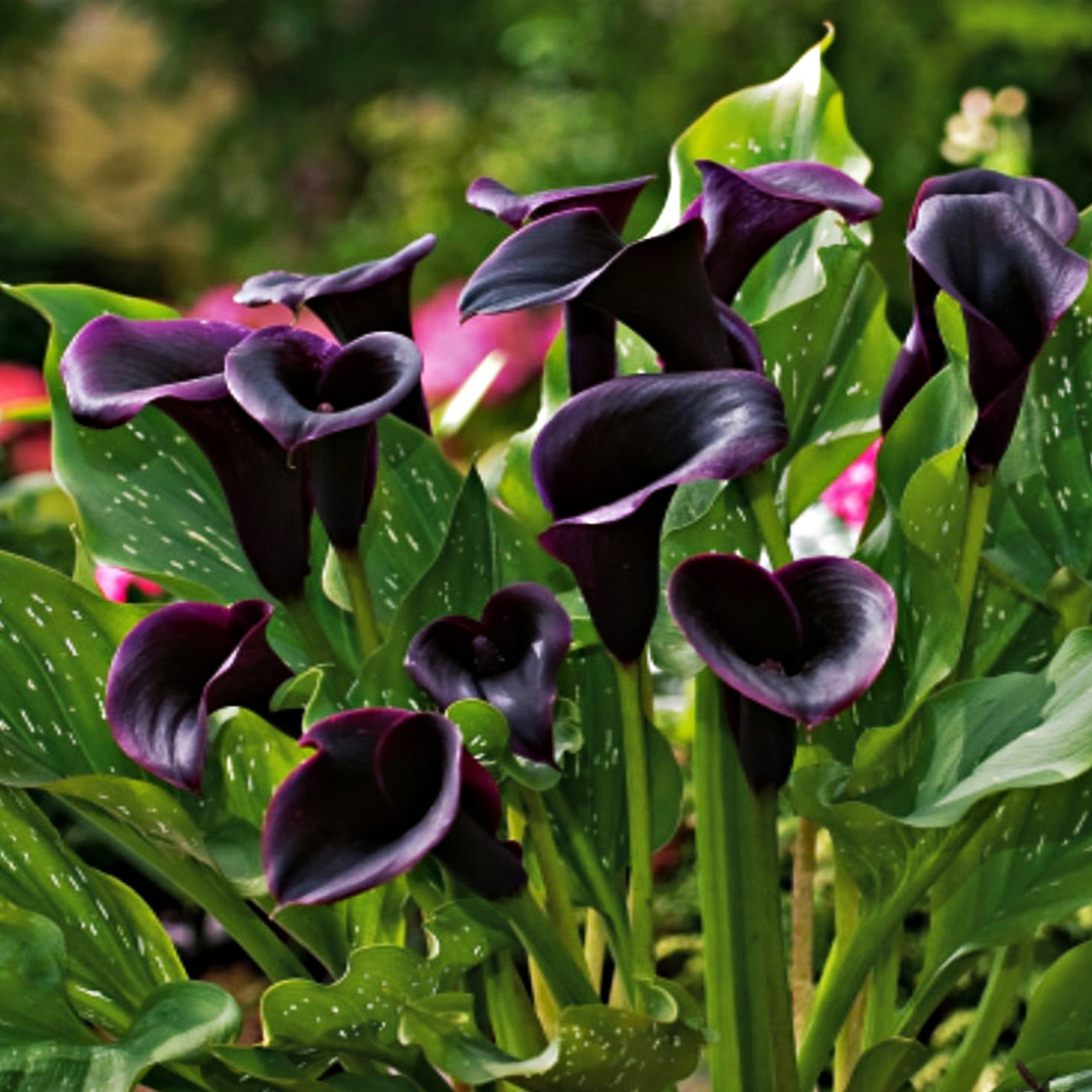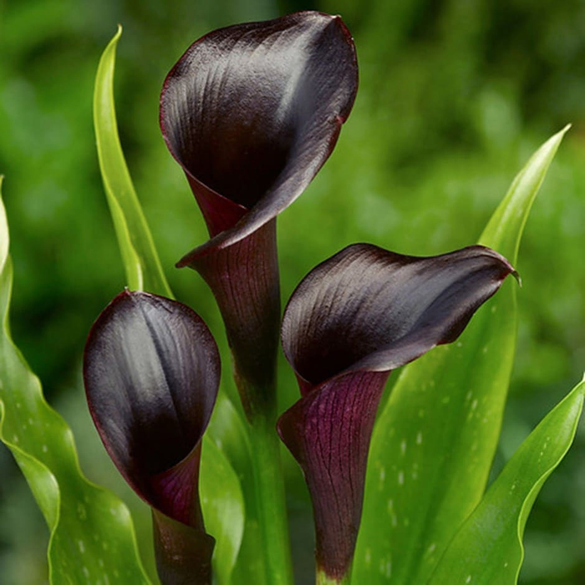 Zantedeschia Odessa, commonly known as the Calla Lily Odessa, is a dramatic addition to any garden with its rich, velvety black blooms tinged with a hint of purple. These stunning flowers are beautifully offset by glossy green foliage, creating an eye-catching display. Perfect for garden borders, patio pots, or as a striking cut flower in floral arrangements, this elegant variety is highly versatile.